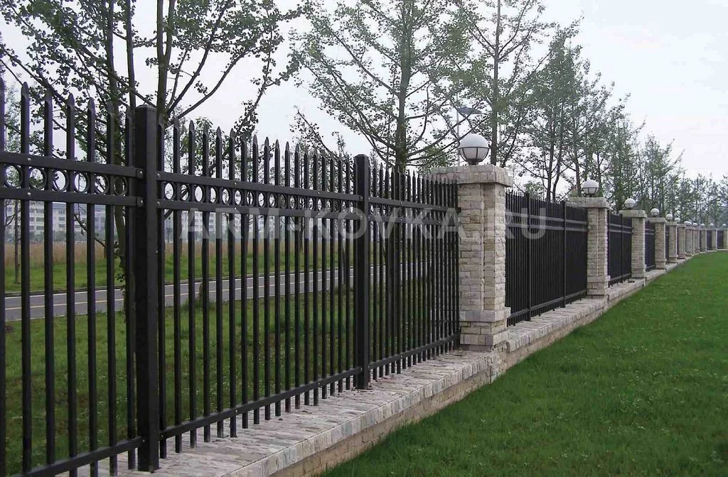 Монументальное и ритмичное ограждение в английском стиле, предназначенное для протяженных участков и парадных въездных групп. Модель «Оксфорд» идеально подходит для загородных резиденций в Истринском районе, обеспечивая надежную защиту территории при сохранении строгого и респектабельного внешнего вида. Конструкция секции базируется на вертикальных стальных прутьях квадратного сечения, которые проходят сквозь двойной горизонтальный поручень. Верхняя часть секции украшена декоративным поясом из металлических колец, заключенных между направляющими, что придает забору классическую элегантность. Каждый вертикальный элемент завершается остроконечной пикой, выполняющей роль защитного навершия. Ограждение устанавливается на невысокий парапет, облицованный натуральным или декоративным камнем, и фиксируется на массивных каменных столбах. Особую функциональность данной модели придают встроенные уличные светильники-сферы, расположенные на вершинах столбов, которые обеспечивают мягкое освещение периметра в темное время суток. Все металлические компоненты защищены порошковым напылением черного цвета, устойчивым к коррозии и перепадам температур. Забор «Оксфорд» — это воплощение архитектурной стабильности и высокого качества исполнения.