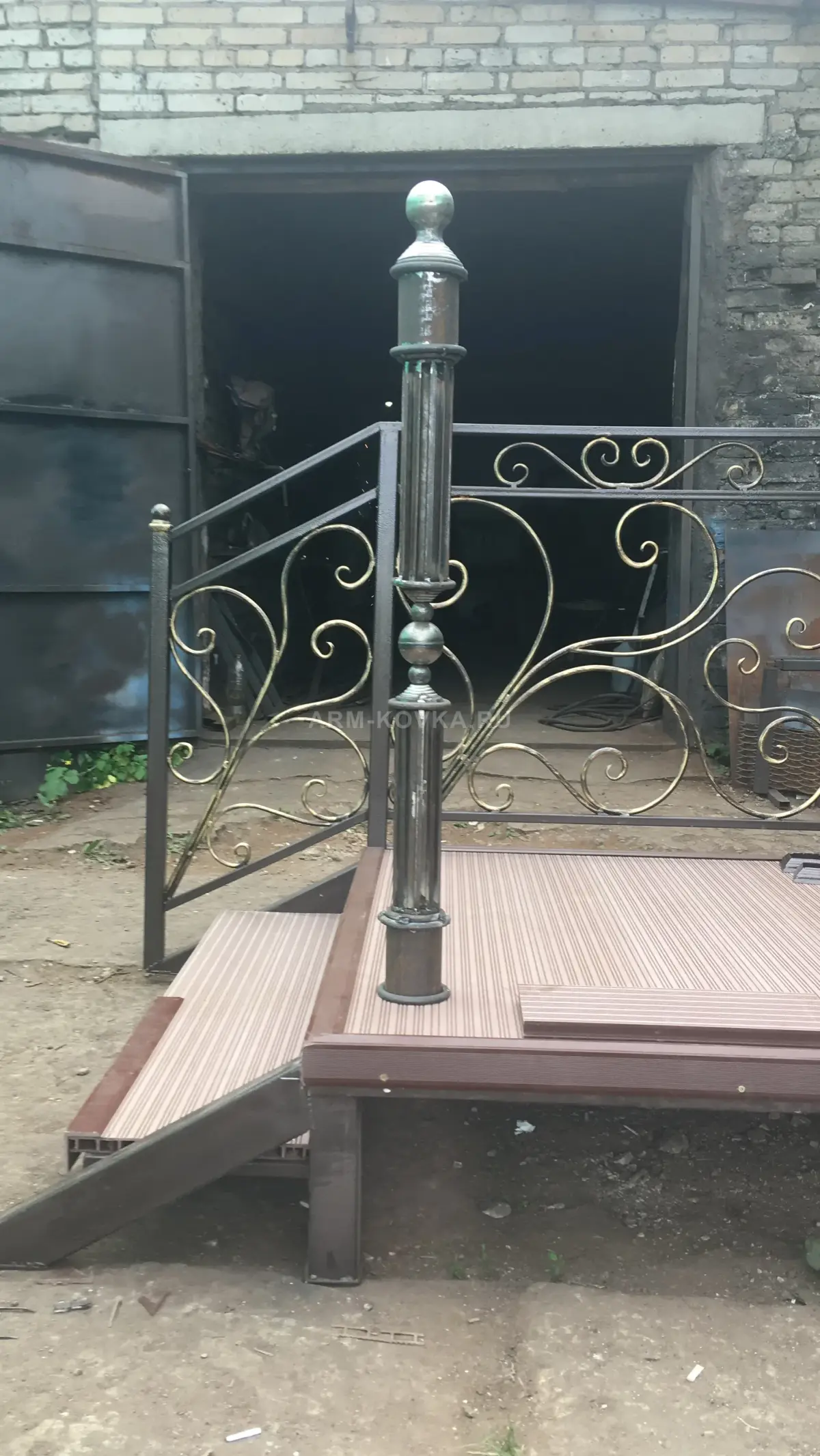 Металлическое ограждение для входных групп и террас, сочетающее элементы классической ковки и литья. Рисунок секций сформирован из крупных изогнутых прутьев, расходящихся веером из одной точки, что создает динамичный радиальный орнамент. Верхняя часть секций дополнена волютообразными завитками, подчеркивающими линию поручня. Главным акцентом конструкции является массивный начальный столб сложной формы с каннелюрами, декоративными перехватами и венчающим шаром-навершием. Все кованые элементы обработаны золотистой патиной, которая выделяет фактуру металла на фоне темного базового покрытия. Конструкция установлена на каркас с использованием террасной доски, что подтверждает её пригодность для эксплуатации в уличных условиях. Высокая плотность узора и использование полнотелого профиля обеспечивают ограждению необходимую жесткость и долговечность.