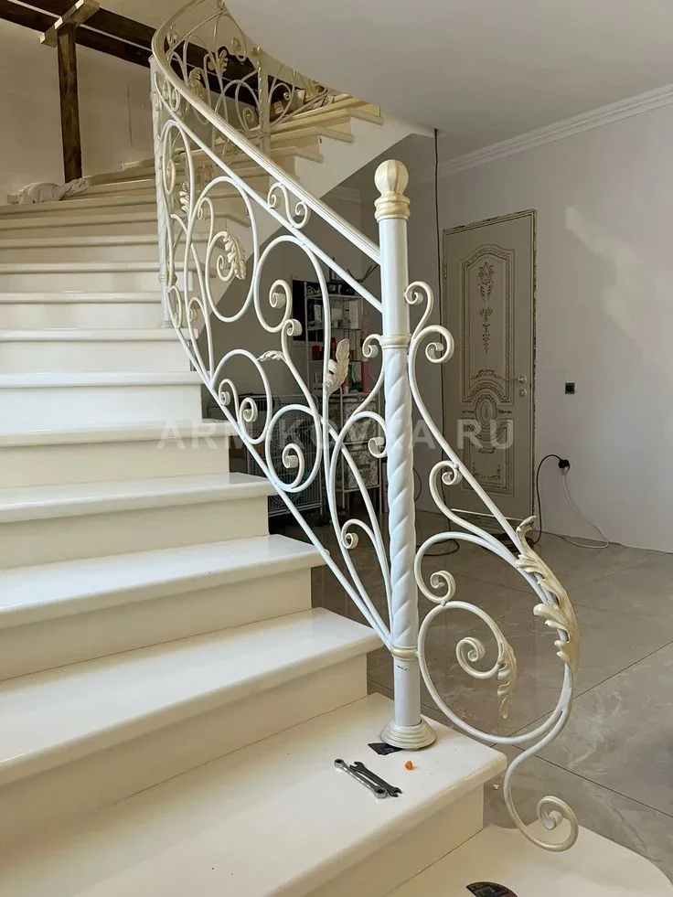 Изысканное кованое ограждение, выполненное в светлых тонах, идеально подходит для классических и неоклассических интерьеров. Рисунок секций состоит из крупных плавных волют и спиралевидных завитков, которые гармонично дополнены литыми элементами в виде акантовых листьев. Центральная опорная стойка имеет массивную витую форму («торсион») и увенчана декоративным навершием в виде шара. Особенностью данной модели является цветовое решение: основной каркас окрашен в молочно-белый цвет, а выступающие части листьев, перехваты на столбе и завитки деликатно подчеркнуты золотистой патиной. Такое сочетание придает лестничному маршу визуальную легкость и торжественность. Поручень плавно переходит в декоративный завиток у основания лестницы, обеспечивая завершенность композиции. Конструкция монтируется на ступени с использованием декоративных литых оснований, скрывающих узлы крепления.