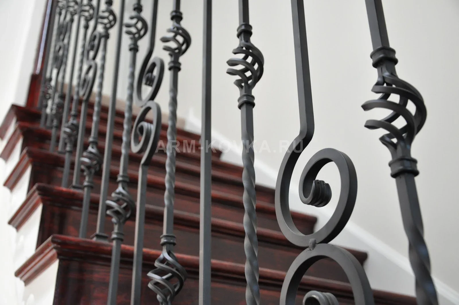 Лаконичное и стильное решение для оформления внутренних лестниц в частных домах и многоуровневых квартирах. Ограждение состоит из чередующихся балясин разного типа: витых стоек («торсионов»), дополненных объемными декоративными «корзинками», и элементов с изящными завитками-волютами в центральной части. Такая комбинация создает ритмичный и легкий визуальный рисунок. Изделия выполнены из качественного металлопроката и окрашены в матовый черный цвет, который выгодно контрастирует с насыщенным темным деревом ступеней. Отсутствие громоздких деталей позволяет использовать эту модель в интерьерах различных стилей — от классики до современного лофта. Каждая балясина имеет индивидуальное крепление к ступени, что обеспечивает надежность всей конструкции и удобство монтажа на готовое напольное покрытие.