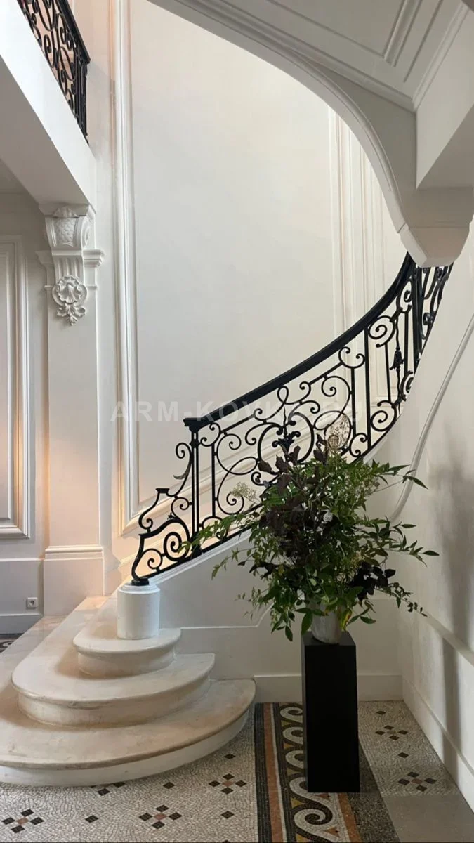 Изысканное интерьерное ограждение, созданное для оформления парадных изогнутых лестниц в классическом стиле. Сложный художественный узор сочетает в себе изящные S-образные волюты, мелкие декоративные завитки и акцентные литые элементы, расположенные в центре композиционных узлов. Плавный изгиб конструкции безупречно повторяет геометрию лестничного марша, подчеркивая архитектурную эстетику пространства. Перила увенчаны строгим профилированным поручнем черного цвета, который в нижней части эффектно завершается волютой, опирающейся на массивный белый постамент. Насыщенный черный цвет металла создает выразительный контраст со светлой отделкой стен и ступенями из натурального камня. Высокая плотность орнамента обеспечивает не только декоративный эффект, но и необходимую эксплуатационную безопасность. Это изделие станет центральным элементом интерьера, подчеркивая монументальность и роскошь дома.