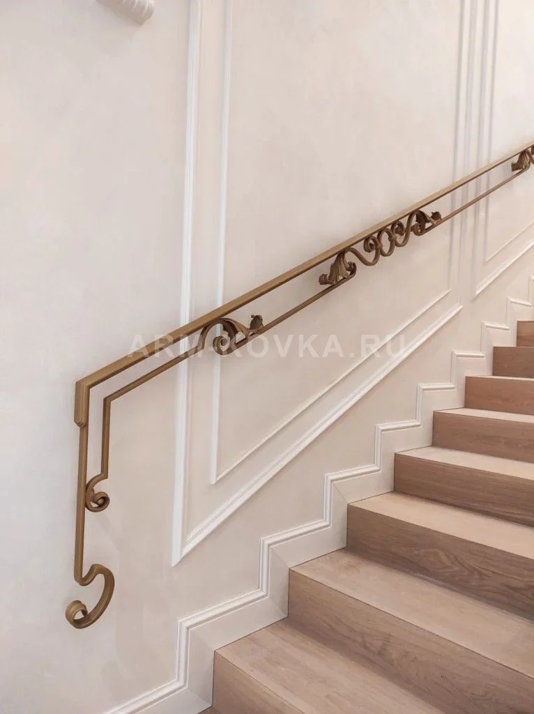 Эксклюзивный пристенный поручень, выполненный в стиле современного ар-деко с элементами неоклассики. Конструкция представляет собой двойную металлическую линию, где основной функциональный поручень дополнен параллельной декоративной полосой. Изюминкой модели является изящный геометрический декор из волют и стилизованных акантовых листьев, расположенный в местах крепления к стене. Особое внимание привлекает благородное цветовое решение — металл окрашен в матовый золотистый оттенок (цвет «латунь» или «шампань»), который придает изделию роскошный и современный вид. Нижняя часть поручня оригинально завершается каскадом убывающих завитков, плавно уходящих вниз по стене. Тонкий профиль и отсутствие массивных элементов позволяют сохранить визуальный объем пространства. Изделие идеально гармонирует с интерьерами в светлых тонах, подчеркивая чистоту линий ступеней из светлого дерева и декоративных настенных молдингов.