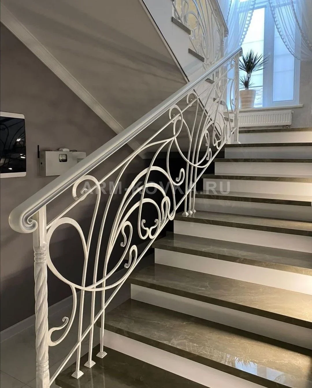 Изысканное интерьерное ограждение, выполненное в жемчужно-белом цвете, который наполняет пространство светом и ощущением чистоты. Художественная композиция построена на переплетении крупных, плавных дуг и тонких динамичных завитков, характерных для стиля модерн или либерти. Ажурный рисунок секций напоминает изгибы крыльев или стебли экзотических растений, создавая эффект невесомости металлической конструкции. Акцентным элементом выступает начальная опорная стойка с фактурной «витой» поверхностью, которая гармонично переходит в гладкий эргономичный поручень, завершающийся элегантной волютой. Белоснежный глянец металла идеально контрастирует с благородным темным мрамором или керамогранитом ступеней, подчеркивая премиальный статус интерьера. Каждая стойка имеет точечное крепление к основанию, обеспечивая надежность при сохранении визуальной легкости. Эти перила станут идеальным выбором для современных светлых домов, где ценится изящество форм и безупречное исполнение деталей.