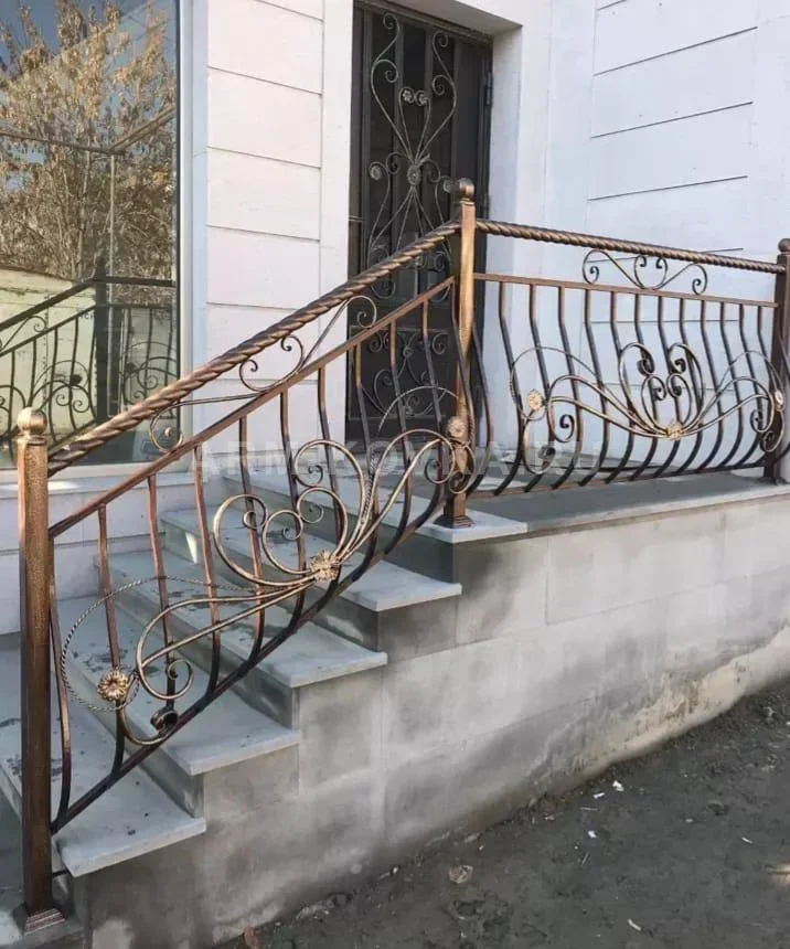 Выразительное уличное ограждение, выполненное с использованием объемных форм и классических декоративных элементов. Главной особенностью модели является «выносной» изгиб нижних стоек (пузатые перила), что визуально расширяет пространство лестничного марша и придает конструкции дополнительный объем. Секции украшены симметричными волютами, в центре которых расположены изящные литые розетки в виде распустившихся цветов. Верхняя часть конструкции дополнена массивным витым поручнем, имитирующим канатное плетение, что обеспечивает удобный хват и подчеркивает монументальность изделия. Ограждение имеет благородное медное патинирование с эффектом состаренного металла, которое эффектно переливается на солнце и гармонирует со светлой облицовкой фасада. Опорные квадратные столбы с декоративными навершиями обеспечивают надежную фиксацию всей системы на ступенях из натурального камня. Дизайн входной группы дополняется кованой дверной решеткой в аналогичном стиле, создавая единый архитектурный ансамбль.