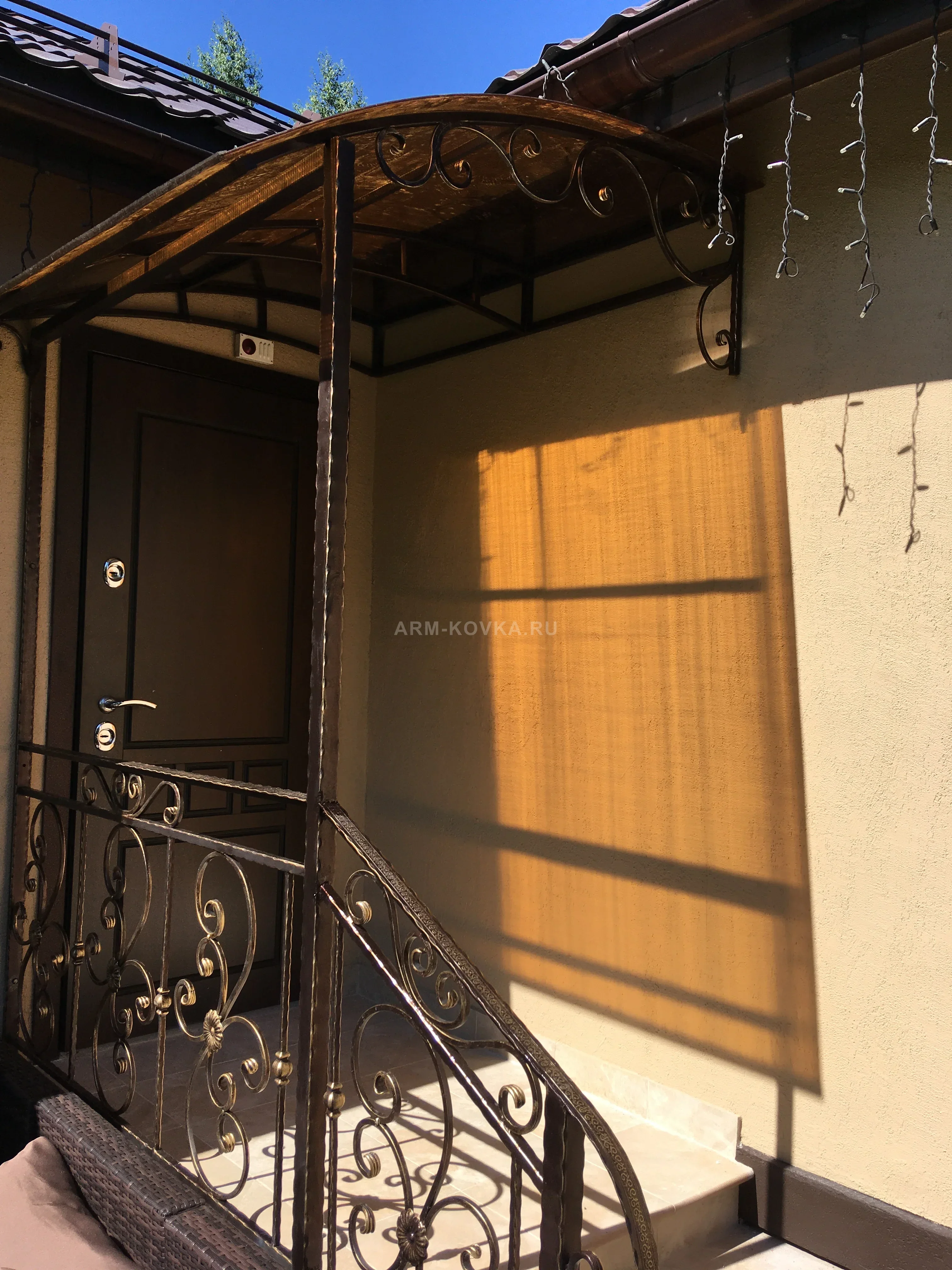 Полноценное оформление входной зоны, включающее в себя изящные кованые перила и функциональный арочный козырек. Дизайн всей группы выдержан в едином стиле: декоративные волюты и литые элементы в виде розеток-цветов создают нарядный и гостеприимный образ дома. Козырек имеет классическую дугообразную форму, усиленную коваными кронштейнами с завитками, и перекрыт качественным сотовым поликарбонатом бронзового оттенка, который мягко рассеивает солнечный свет. Перила плавно спускаются по ступеням, обеспечивая надежную опору. Вся конструкция окрашена в глубокий темный цвет с эффектом античного золотого патинирования, что придает металлу благородный блеск и подчеркивает ручную работу мастера. Такая входная группа не только защищает крыльцо от осадков, но и служит главным архитектурным украшением фасада.