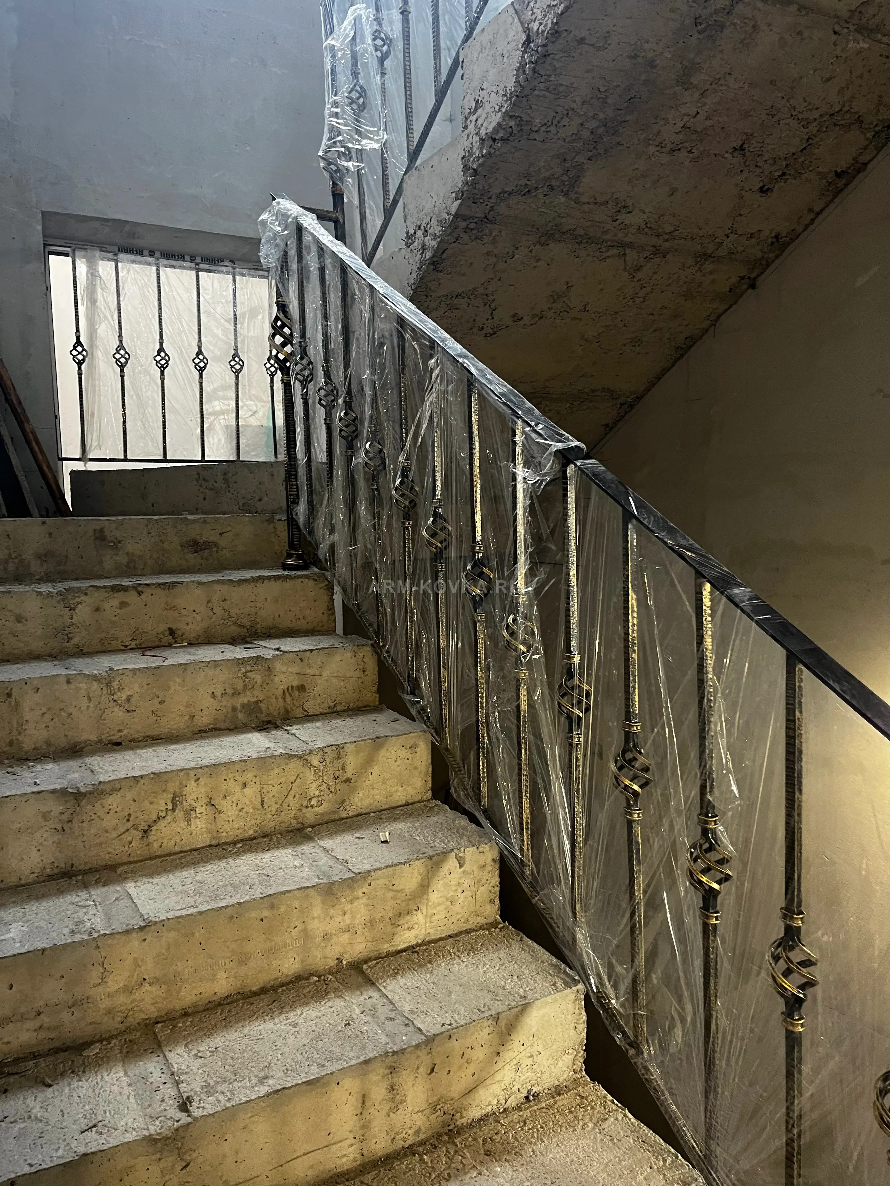 Классическое и надежное ограждение для внутренних лестничных маршей, выполненное в строгом геометрическом стиле. Основу рисунка составляют вертикальные балясины из торсированного (витого) металлического квадрата, чередующиеся с элементами, украшенными объемными коваными «корзинками». Такая комбинация придает конструкции ритмичность и элегантность. Изделие имеет глубокое темное покрытие с выразительным золотым патинированием, которое акцентирует внимание на витых деталях и гранях металла. Лаконичный плоский поручень обеспечивает удобный хват и подчеркивает современный подход к классическому дизайну. На фото представлена стадия завершения монтажа на бетонное основание лестницы, что демонстрирует универсальность модели для различных типов черновых отделок. Эти перила станут отличным решением для тех, кто ищет баланс между доступной ценой и презентабельным внешним видом.