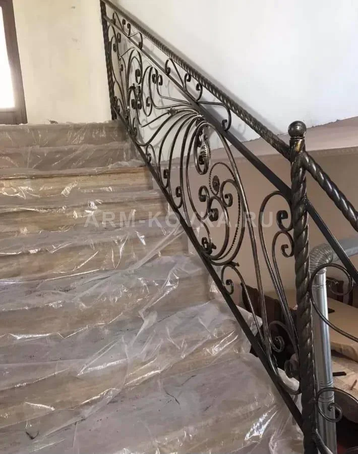 Художественное ограждение для лестниц с выразительным природным орнаментом. Рисунок наполнен сложными переплетениями линий, имитирующими лозу, и дополнен коваными листьями и завитками. Опорные столбы и поручень имеют глубокую витую фактуру, подчеркивающую крафтовый характер изделия. Темное покрытие с бронзовой патиной придает перилам антикварный вид. На фото зафиксирован процесс монтажа на бетонную лестницу, защищенную пленкой.