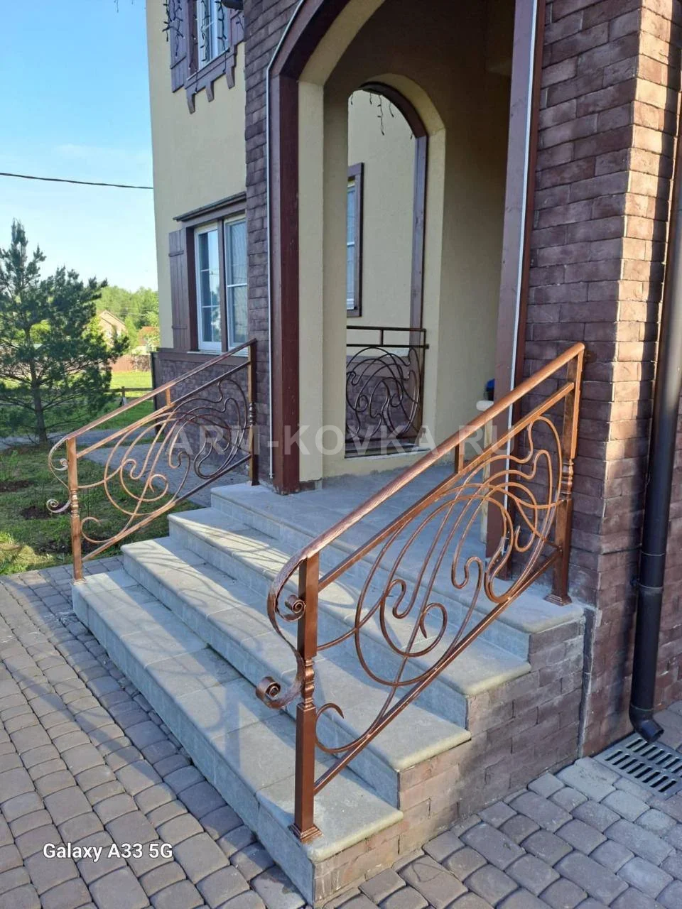 Элегантное уличное ограждение в стиле модерн, отличающееся плавностью линий и динамичным рисунком. Основная композиция секций построена на переплетении крупных без осевых завитков, которые создают эффект легкого, «воздушного» наполнения. Особое внимание уделено деталям: начало поручня и нижняя часть опорных стоек украшены изящными закрученными валютами, выходящими за пределы основной конструкции. Перила имеют благородное медное покрытие с мягким блеском, которое идеально гармонирует с коричневой кирпичной кладкой фасада и серой тротуарной плиткой. Лаконичный плоский поручень обеспечивает удобство, а прочные квадратные столбики — надежную фиксацию на каменных ступенях крыльца. Эта модель станет изысканным акцентом для загородного дома, сочетая в себе современную эстетику и надежность металла.