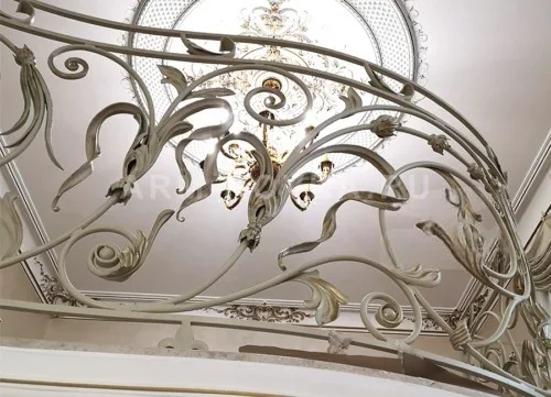 Эксклюзивное кованое ограждение для второго света или радиусной лестницы, выполненное в стиле высокого барокко. Композиция отличается сложным объемным рисунком, состоящим из крупных акантовых листьев, изящных бутонов и динамичных волют. Каждый элемент декора тщательно проработан мастером вручную, что придает металлу живую, органическую форму. Изделие окрашено в благородный кремовый цвет (слоновая кость) с изысканным золотым патинированием, которое подчеркивает рельеф ковки и идеально сочетается с классической лепниной на потолке и богатой люстрой. Плавный изгиб конструкции (радиус) подчеркивает архитектурную сложность интерьера и создает атмосферу дворцовой роскоши. Это решение для тех, кто ищет истинное произведение искусства для своего дома.