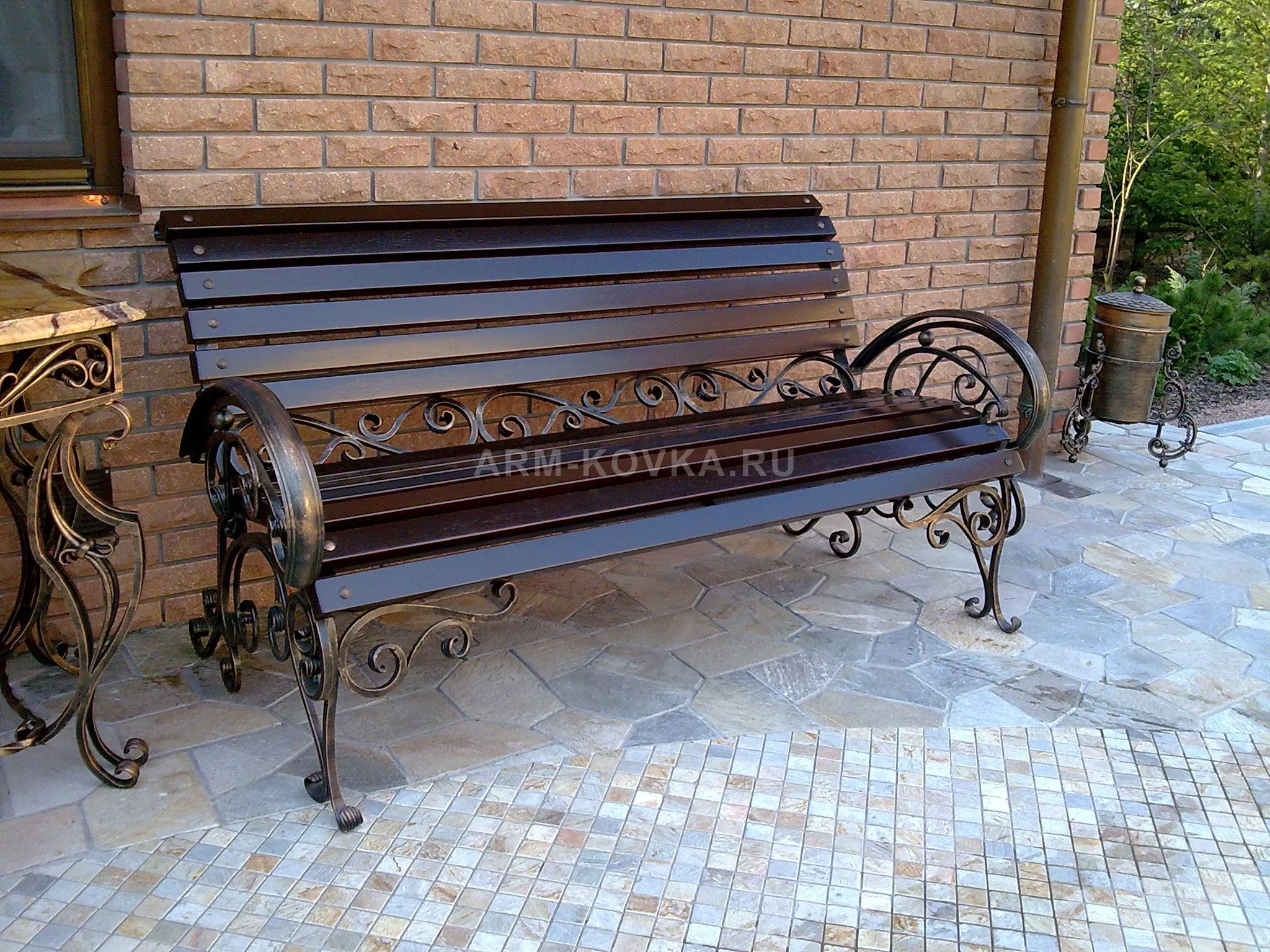 Изысканная садовая скамья премиум-класса, созданная для тех, кто стремится превратить придомовую территорию в зону аристократического комфорта. Эта модель воплощает в себе лучшие традиции художественной ковки, сочетая монументальность металлического каркаса с утонченным декоративным плетением. Изделие спроектировано как долговечный элемент паркового или садового ансамбля, устойчивый к суровым климатическим условиям Истринского района. Основой конструкции служит мощный сварной каркас, украшенный сложными ажурными волютами и коваными завитками под сиденьем и на боковых опорах. Особое внимание уделено эргономике: широкие дугообразные подлокотники обеспечивают удобство посадки, а анатомический изгиб спинки позволяет максимально расслабиться. Сиденье и спинка выполнены из отборного бруса твердых пород, покрытого несколькими слоями атмосферостойкого лака благородного темного оттенка. Металлические элементы обработаны антикоррозийным составом и декорированы вручную медной патиной, которая придает скамье эффект антикварной бронзы. Благодаря своему классическому дизайну, модель «Версаль» станет идеальным дополнением к входной группе дома, террасе или уединенной аллее вашего сада.