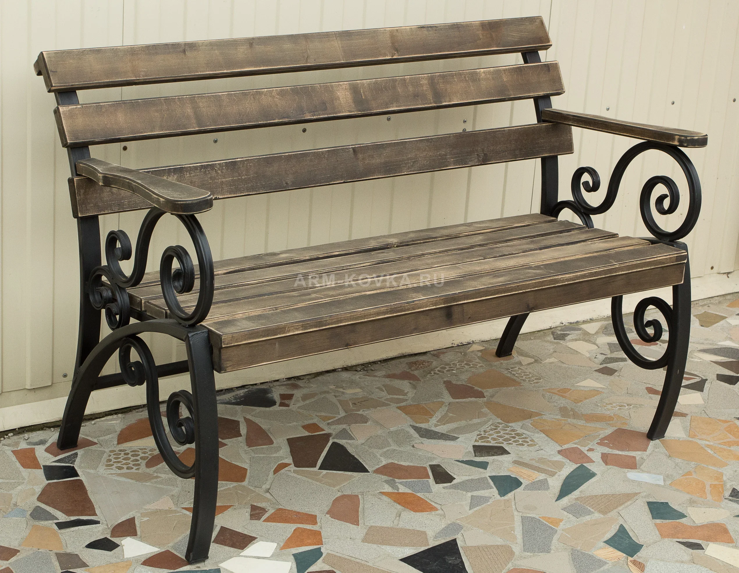 Классическая садовая скамья, сочетающая в себе основательность конструкции и изящество художественного декора. Эта модель разработана для ценителей комфортного отдыха на свежем воздухе и станет статусным украшением террасы, парадного входа или уютной аллеи. Благодаря использованию качественных материалов и защитных покрытий, изделие сохраняет безупречный вид при любых погодных условиях. Главной конструктивной особенностью скамьи являются широкие деревянные подлокотники, которые обеспечивают приятный тактильный контакт и дополнительное удобство. Боковые опоры украшены симметричными коваными волютами, плавно переходящими в изогнутые ножки. Сиденье и высокая спинка набраны из массивного бруса с выразительной текстурой дерева. Древесина обработана специальным составом с эффектом благородного старения и защищена износостойким лаком. Металлический каркас окрашен в черный цвет и вручную подчеркнут золотистой патиной, что придает изделию аристократичный и завершенный вид. Продуманный угол наклона спинки обеспечивает анатомически правильную посадку. Эта надежная и эстетичная скамья — прекрасное решение для благоустройства территорий в Истринском районе.