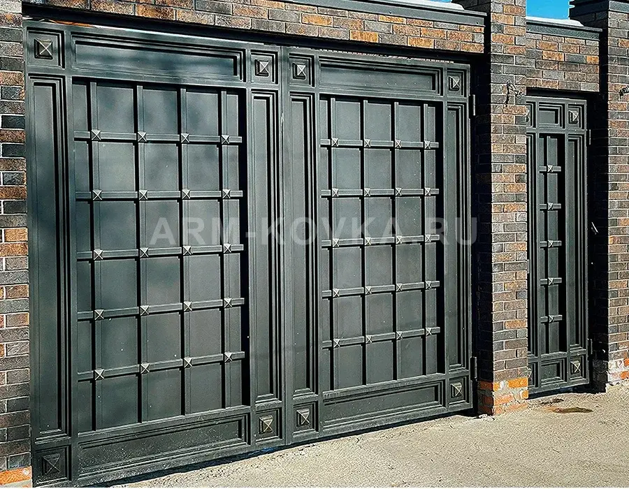 Массивные и строгие ворота закрытого типа, дополненные отдельно стоящей калиткой в едином стиле. Дизайн основан на четких геометрических линиях: глухое темное полотно разделено на крупные квадраты накладным металлическим профилем. В каждом месте пересечения профиля установлены декоративные квадратные клепки с пирамидальной вершиной, окрашенные в цвет старой бронзы. Рама ворот и калитки имеет многоступенчатый рельеф, что придает конструкции дополнительный объем и монументальность. Изделие интегрировано в забор из темного фактурного кирпича, подчеркивающего современный и надежный облик всей входной группы. Это идеальное решение для тех, кто предпочитает минимализм и защищенность без лишних ажурных элементов.