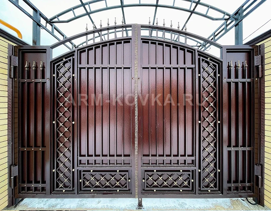 Элегантные распашные ворота, сочетающие классические формы и строгие декоративные элементы. Центральная часть створок выполнена из вертикального металлического профиля, разделенного горизонтальными перекладинами. Особую изысканность модели придает центральная вертикальная полоса с золотистым греческим орнаментом «меандр». Боковые секции и нижние вставки ворот заполнены декоративной ромбовидной решеткой, каждое пересечение которой акцентировано золотистой клепкой. Верхняя часть конструкции имеет арочную форму и увенчана рядом защитных пик. Изделие выполнено в насыщенном шоколадном цвете с глянцевым блеском, что в сочетании с золотым декором создает премиальный внешний вид. Ворота установлены под защитным навесом, что подчеркивает их функциональность и долговечность.