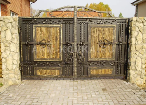 Комбинированная модель из металла и натурального дерева. Центральные панели выполнены из обожженного дерева с ярко выраженной фактурой, украшены массивными декоративными петлями в средневековом стиле. Металлическая рама дополнена торсированными (витыми) прутьями, коваными листьями и волютами. Мощные столбы из дикого камня завершают образ надежной крепостной входной группы.