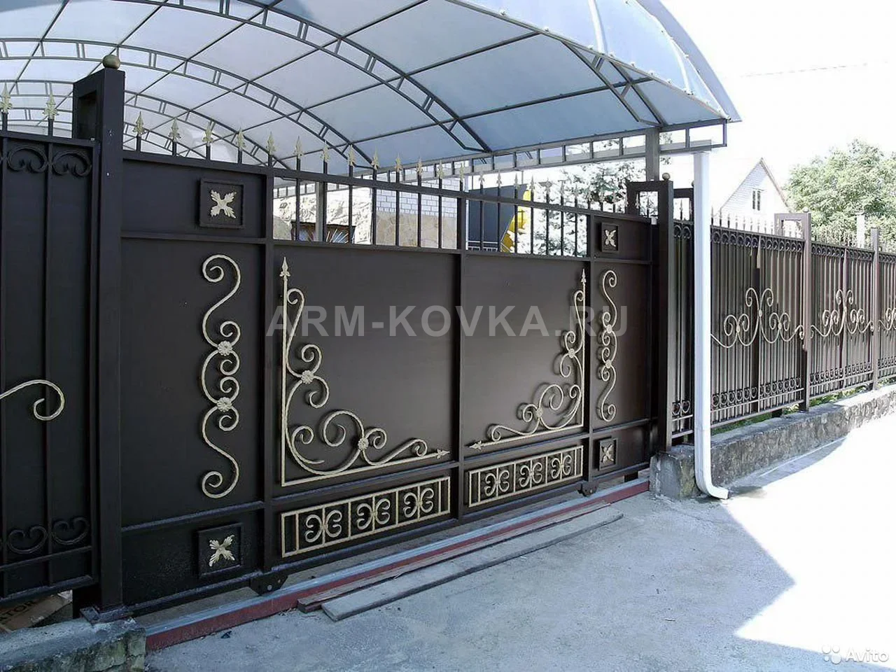 Элегантные откатные ворота закрытого типа, выполненные в глубоком темно-коричневом цвете. Гладкое полотно разделено на секции и украшено изящной золотистой ковкой: угловыми ажурными элементами и вертикальной «волной» с цветочными розетками. Нижняя часть ворот дополнена декоративной решеткой с повторяющимся овальным орнаментом. Верхний край конструкции украшен рядом острых пик, обеспечивающих дополнительную защиту. Ворота установлены под защитным светопрозрачным навесом, что подчеркивает их практичность и долговечность.