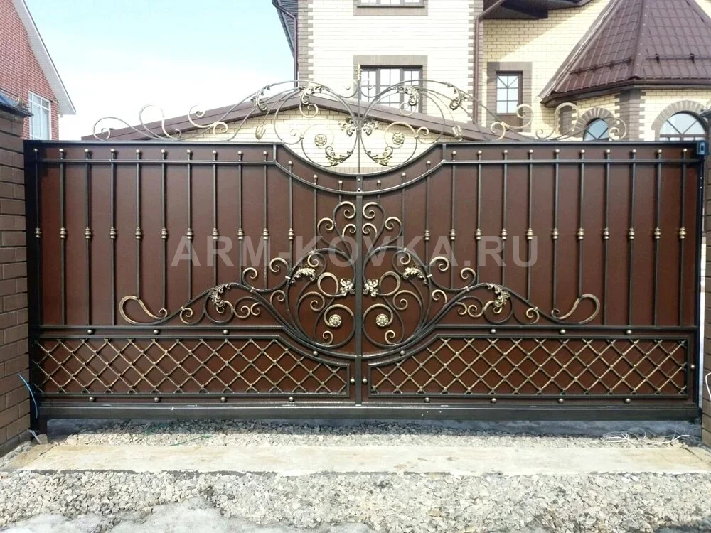 Элегантные откатные ворота, выполненные в глубоком шоколадном цвете с богатым кованым декором. Нижняя часть полотна оформлена плотной ромбовидной решеткой с золотистыми клепками на пересечениях, что придает конструкции визуальную устойчивость. Центральную часть створок украшает масштабная симметричная композиция из изящных завитков и кованых листьев, покрытых бронзовой патиной. Основное поле ворот заполнено вертикальными прутьями с декоративными пиками, а верхний контур имеет сложный волнообразный изгиб. Венчает изделие воздушный арочный гребень с центральным кованым элементом, гармонично дополняющий архитектурный облик современного загородного дома.