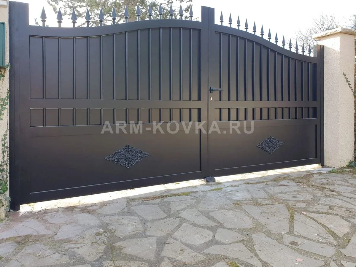 Строгие распашные ворота в современном стиле, выполненные в глубоком черном цвете с благородной матовой фактурой. Нижняя часть створок представляет собой сплошное металлическое полотно, украшенное изящными ромбовидными барельефами с растительным орнаментом в центре. Верхняя часть ворот имеет арочный изгиб и заполнена вертикальными профилями, разделенными горизонтальной перекладиной, что создает легкий ритмичный рисунок. Конструкция увенчана рядом классических защитных пик. Лаконичная дверная ручка и надежная фурнитура подчеркивают функциональность модели. Ворота идеально подходят для частных домов, оформленных в стиле минимализма или современной классики, обеспечивая надежную защиту и эстетичный вид въездной группы.