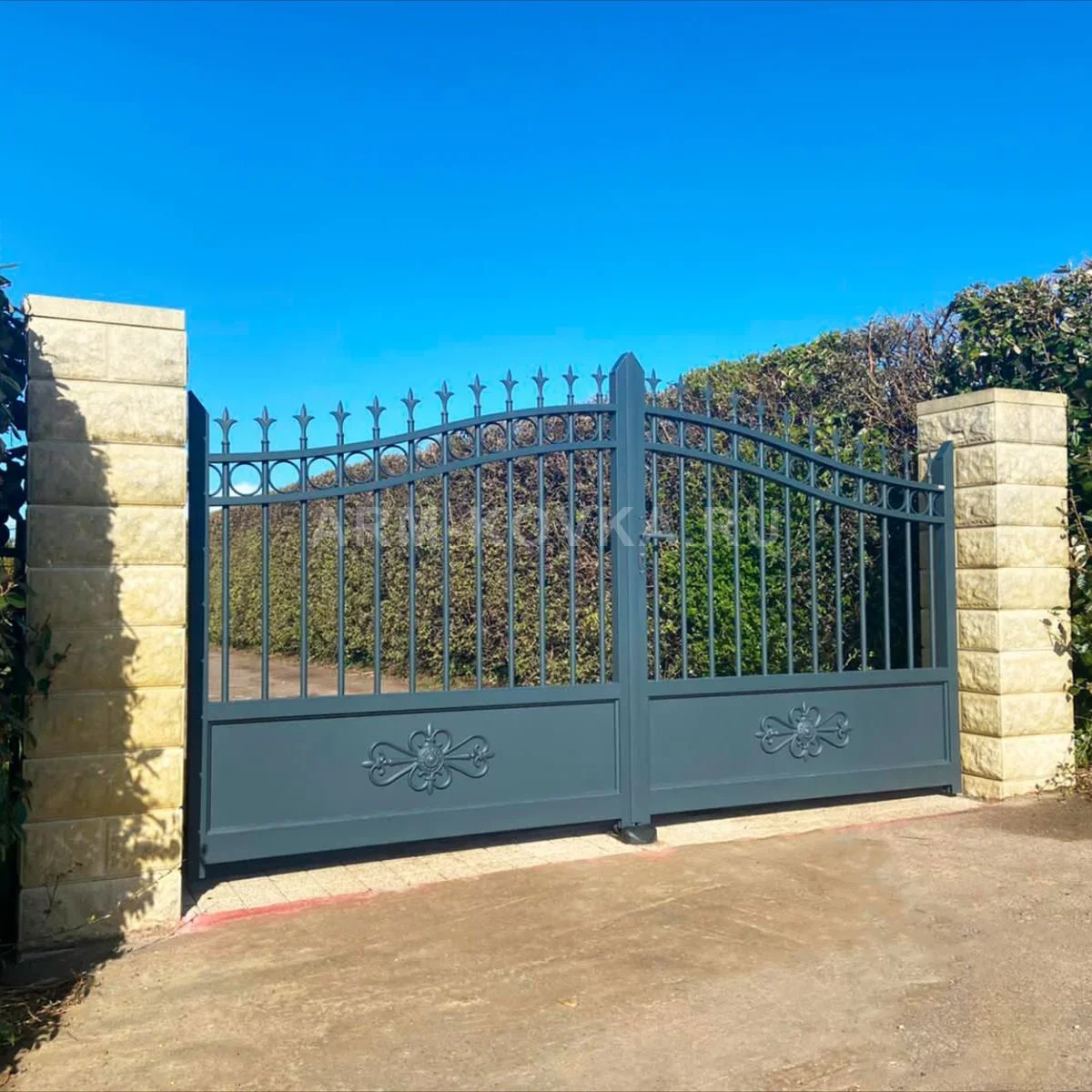 Элегантные распашные ворота в современном классическом стиле, выполненные в глубоком графитовом цвете. Нижняя часть створок представлена глухим металлическим полотном, украшенным симметричными литыми розетками с цветочным орнаментом. Основное поле ворот заполнено тонкими вертикальными прутьями, которые переходят в изящный арочный свод. Верхний контур ворот акцентирован декоративным поясом из кованых колец и увенчан рядом классических пик с литыми наконечниками. Конструкция установлена между массивными столбами из светлого фактурного камня, что создает эффектный контраст с темным металлом и подчеркивает статусность въездной группы. Модель идеально сочетает в себе визуальную легкость и надежную защиту территории.