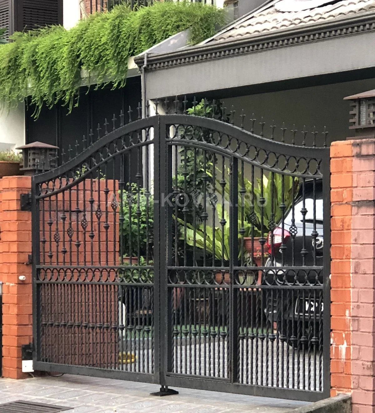 Массивные распашные ворота сквозного типа, выполненные в классическом стиле с акцентом на сложную геометрию прутьев. Створки имеют выразительный арочный изгиб, подчеркнутый верхним декоративным поясом из кованых овальных колец. Вертикальное наполнение ворот разделено на два яруса центральной горизонтальной перекладиной с аналогичным кольцевым орнаментом. Нижний ярус состоит из плотно расположенных витых прутьев, придающих конструкции фактурность и визуальный вес. В верхней секции чередуются гладкие прутья и элементы с коваными «корзинками». Завершает ансамбль ряд защитных пик с литыми наконечниками. Ворота установлены между столбами из красного кирпича, что создает гармоничный и защищенный образ загородного таунхауса.