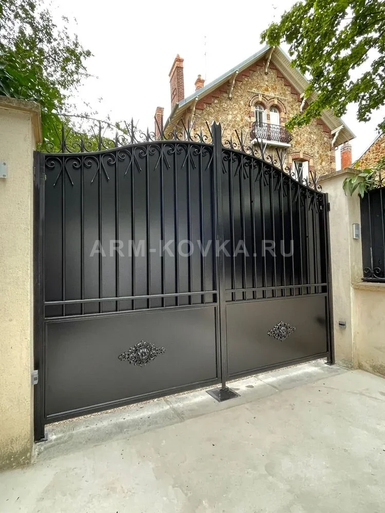 Монументальные распашные ворота, выполненные в классическом европейском стиле с матовым черным покрытием. Нижняя часть створок представляет собой глухое металлическое полотно, в центре которого расположены изысканные кованые розетки с объемным цветочным орнаментом. Средняя секция ворот заполнена широкими вертикальными профилями, обеспечивающими визуальную плотность конструкции. Верхняя часть имеет выразительный арочный контур и украшена изящными коваными завитками-волютами. Венчает изделие ряд острых защитных пик, которые не только выполняют охранную функцию, но и придают въездной группе торжественный вид. Ворота идеально сочетаются с фасадами из натурального камня и кирпича, подчеркивая статус и эстетический вкус владельца усадьбы.