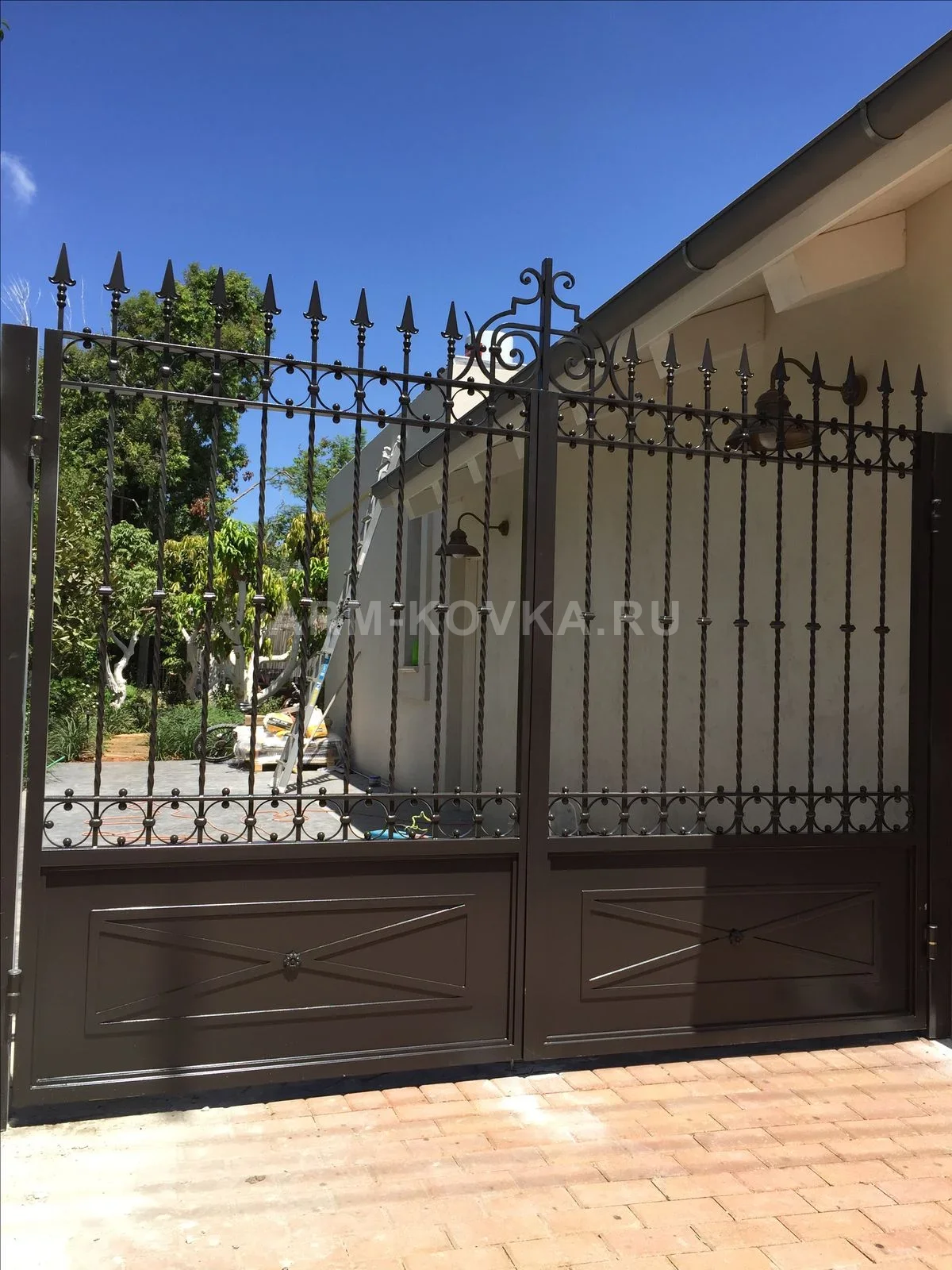 Благородные распашные ворота комбинированного типа в глубоком кофейном оттенке. Нижняя часть створок выполнена в виде глухого цоколя с объемными прямоугольными филенками, декорированными Х-образными перекрестиями и центральными коваными розетками. Верхнее полотно ворот имеет сквозную структуру, набранную из изящных витых прутьев. Конструкция украшена двумя горизонтальными декоративными поясами из кованых колец — в основании и в верхней части секций. Венчает ворота ряд классических защитных пик, а центральный стык створок акцентирован ажурным кованым гребнем с волютами. Модель сочетает в себе визуальную легкость и монументальность, идеально дополняя архитектуру загородного поместья или классической усадьбы.