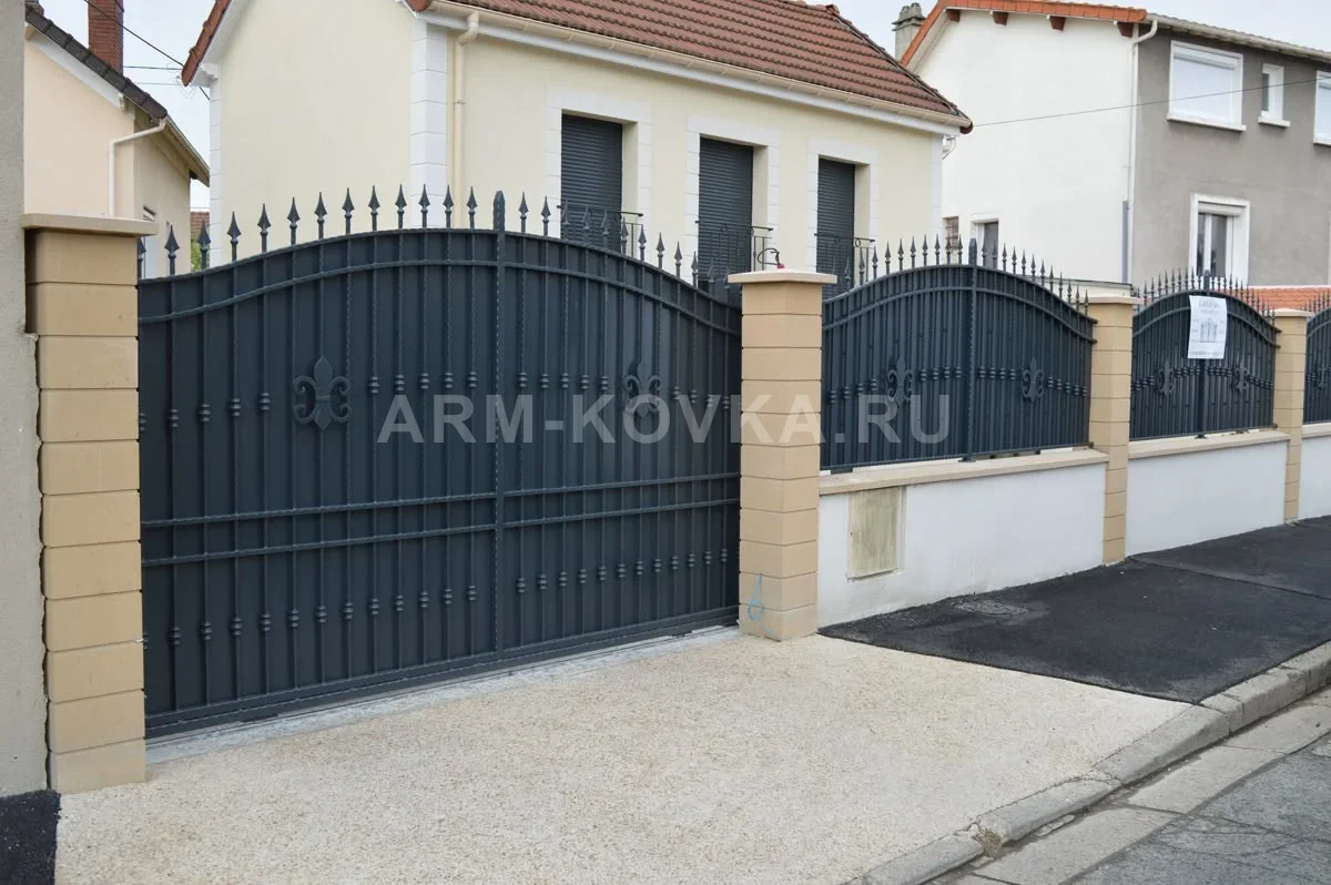 Величественные распашные ворота в классическом европейском стиле, выполненные в глубоком антрацитовом цвете. Конструкция отличается выразительным арочным изгибом верхнего края и плотным вертикальным заполнением. Центральным декоративным элементом каждой створки является объемная геральдическая лилия (Fleur-de-lis), дополненная горизонтальными поясами из кованых зажимов, которые придают полотну фактурность. Верхний контур ворот увенчан рядом строгих защитных пик с литыми наконечниками. Въездная группа установлена между массивными наборными столбами песочного оттенка, что создает гармоничный контраст с темным металлом. Данная модель идеально подходит для оформления парадного въезда в частную резиденцию, обеспечивая высокий уровень приватности и подчеркивая респектабельность владения.
