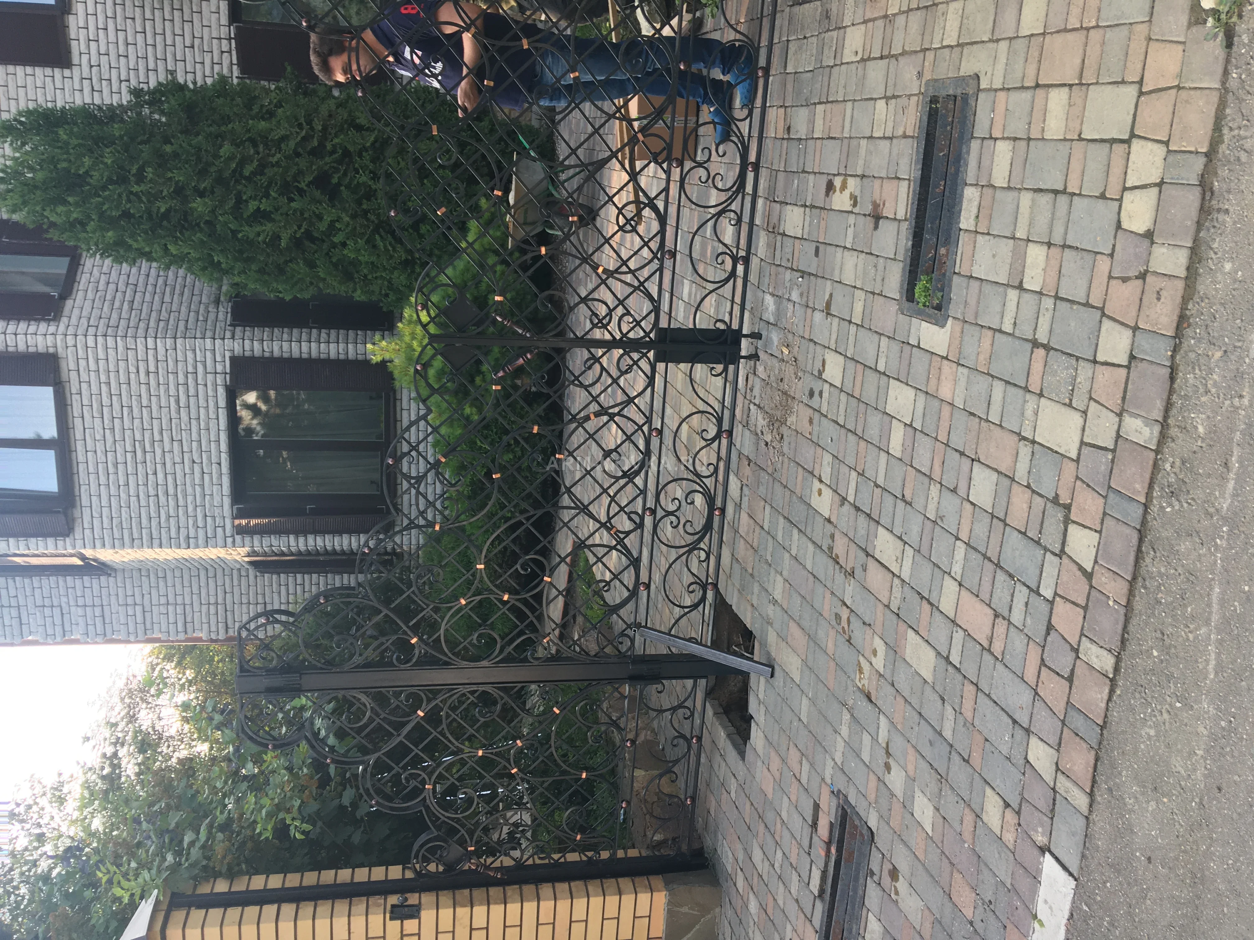 Ажурные распашные ворота сквозного типа, представляющие собой сложное переплетение кованых узоров в восточном стиле. Конструкция отличается богатым орнаментом из волют и завитков, которые образуют симметричный рисунок по всей площади створок. Особенностью данной модели является использование медной патины на декоративных хомутах и отдельных элементах ковки, что придает металлу антикварный вид и подчеркивает ручную работу кузнеца. Верхний край ворот имеет сложную волнообразную форму, плавно переходящую в высокие центральные пики. Нижняя часть усилена горизонтальными перекладинами с повторяющимся узором, обеспечивающим жесткость каркаса. Такие ворота идеально дополнят ландшафт загородного дома, оформленного натуральным камнем или декоративным кирпичом, создавая атмосферу уюта и классической роскоши.