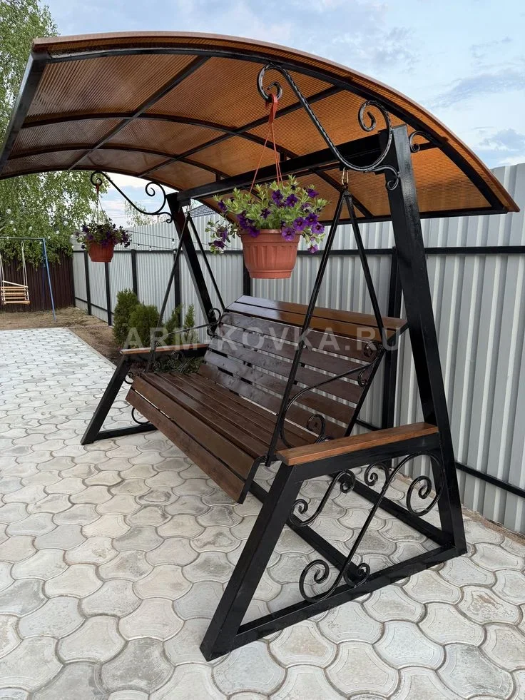 Данная модель представляет собой классические садовые качели, выполненные с акцентом на декоративность и комфорт. Основой конструкции служит мощный сварной каркас из стального профиля с А-образными боковыми опорами, обеспечивающими отличную устойчивость на твердых покрытиях. Боковые панели украшены изящными коваными завитками («волютами»), которые не только придают изделию эстетичный вид, но и служат дополнительными ребрами жесткости для рамы. Сиденье качелей — трехместное, подвешенное на надежных стальных цепях. Спинка и посадочное место облицованы широкими деревянными рейками, покрытыми защитным лаком насыщенного цвета «палисандр», что делает их приятными на ощупь и устойчивыми к атмосферным воздействиям. Подлокотники снабжены деревянными накладками, а боковины сиденья также дополнены ажурными коваными элементами, поддерживающими общий стиль конструкции. Над качелями смонтирован легкий арочный навес из сотового поликарбоната бронзового оттенка. Изогнутая форма кровли в сочетании с коваными кронштейнами для подвесных кашпо делает эту модель центральным элементом ландшафтного дизайна. Поликарбонат эффективно рассеивает солнечный свет и защищает от небольшого дождя, позволяя наслаждаться отдыхом на свежем воздухе в любую погоду. Металлические части защищены глянцевым порошковым покрытием черного цвета, устойчивым к сколам и выгоранию.