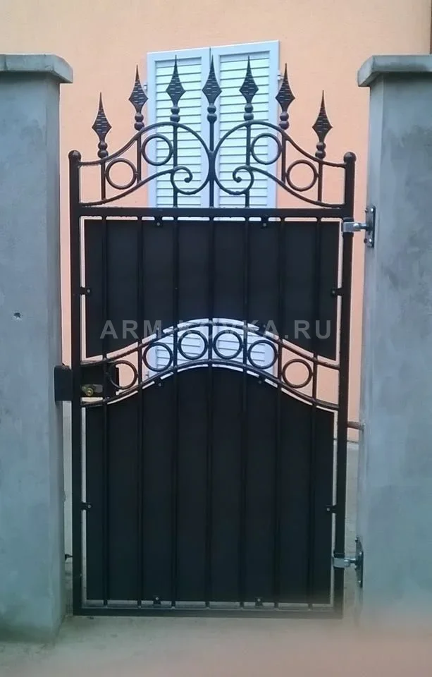 Оригинальная кованая калитка комбинированного типа, сочетающая в себе защитные свойства закрытого полотна и изящество сквозных декоративных элементов. Конструкция выполнена из металла с качественным черным покрытием. Особенностью модели является разделение глухого фона на две секции, между которыми проходит изящный арочный пояс, заполненный декоративными кольцами. Верхняя часть калитки имеет выразительное ажурное завершение в виде волют и завитков, увенчанное пятью фигурными пиками ромбовидной формы. Вертикальные прутья проходят сквозь всю конструкцию, обеспечивая её жесткость и создавая строгий ритмичный рисунок. Калитка установлена в проем между массивными бетонными столбами, создавая современный и одновременно классический образ входной группы. Модель оснащена врезным замком с компактной фурнитурой, идеально подходя для благоустройства частных территорий, где требуется баланс между приватностью и эстетикой художественной ковки. Изделие разработано в рамках профессиональных решений по созданию долговечных и стильных ограждений.