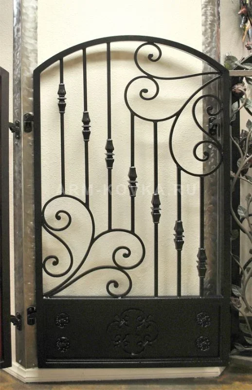 Артистичная кованая калитка сквозного типа, сочетающая в себе строгость вертикальных линий и динамику плавных форм. Изделие выполнено из высококачественного металла с глубоким черным матовым покрытием. Дизайн модели отличается оригинальной асимметричной композицией, которая придает входной группе индивидуальный характер. Полотно калитки заполнено вертикальными прутьями, украшенными декоративными точеными элементами (балясинами), расположенными на разной высоте. Левая нижняя и правая верхняя части изделия акцентированы крупными изящными завитками и волютами, создающими визуальный баланс. Нижняя часть усилена глухим металлическим цоколем, декорированным накладными коваными розетками и центральным рельефным узором. Верхний край калитки имеет выразительную арочную форму, завершающую архитектурный образ. Данная модель идеально подходит для благоустройства частных территорий и садов, владельцы которых ценят нестандартные художественные решения и высокое качество исполнения. Изделие спроектировано для долговечной службы и легкой интеграции с различными типами ограждений.