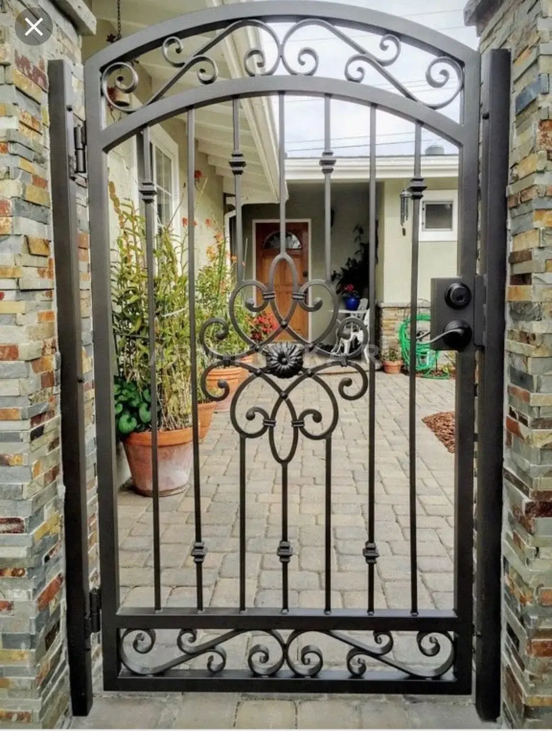 Изящная кованая калитка сквозного типа, выполненная в классическом стиле, сочетает в себе легкость конструкции и изысканность декоративных элементов. Изделие изготовлено из металла с качественным темно-серым матовым покрытием, обеспечивающим долговечность и устойчивость к внешним воздействиям. Верхняя часть калитки оформлена в виде плавной арочной фрамуги, украшенной симметричными завитками и волютами. Основное полотно заполнено вертикальными прутьями, акцентированными декоративными перехватами. Центральным элементом композиции является сложный кованый орнамент в форме цветка с объемной сердцевиной-розеткой, от которой расходятся плавные лепестки-завитки. Нижний пояс изделия повторяет ажурный рисунок верха, обеспечивая визуальную завершенность всей конструкции. Калитка установлена в проем между столбами из фактурного природного камня, открывая вид на уютный внутренний дворик, вымощенный тротуарной плиткой. Модель укомплектована надежным замком с эргономичной массивной ручкой черного цвета. Данное решение идеально подходит для благоустройства территорий частных домов и загородных резиденций, подчеркивая высокий статус и вкус владельца.