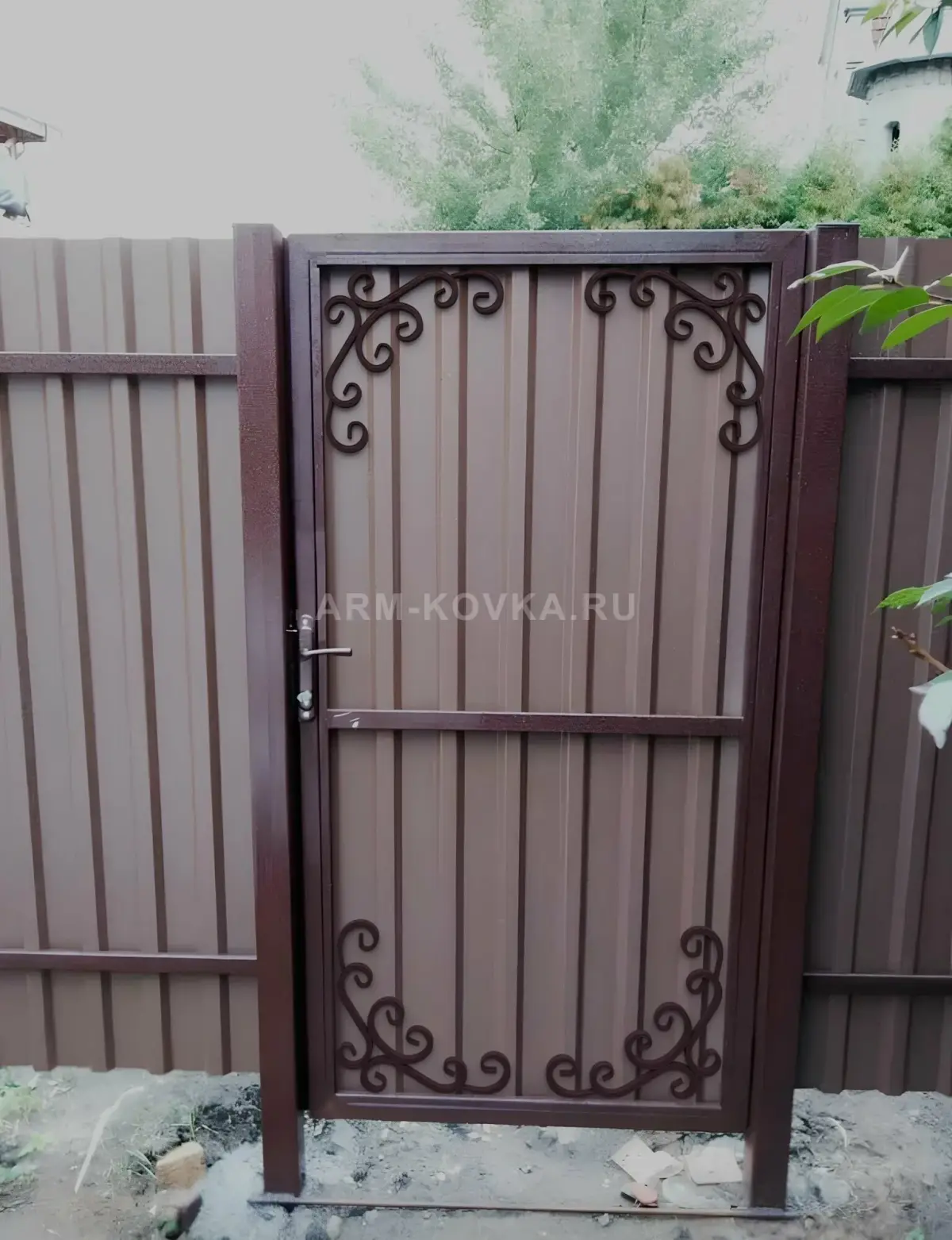 Практичная и надежная калитка закрытого типа, представляющая собой оптимальное сочетание функциональности и декоративного оформления. Полотно изделия выполнено из металлического профилированного листа коричневого цвета, что обеспечивает полную изоляцию территории от посторонних глаз и дорожной пыли. Данная модель является частью профессиональных решений по благоустройству загородных участков и территорий. Дизайн калитки отличается лаконичностью: строгий прямоугольный каркас из металлического профиля дополнен изящными накладными элементами художественной ковки в виде симметричных завитков и волют, расположенных по углам полотна. Эти ажурные вставки придают бюджетной конструкции индивидуальность и эстетичный внешний вид. Калитка интегрирована в общее ограждение из профлиста, создавая единую и законченную композицию входной группы. Модель оснащена удобной нажимной ручкой и врезным замком, обеспечивая надежную защиту и простоту в повседневной эксплуатации. Изделие спроектировано для долговечной службы в условиях переменчивого климата.