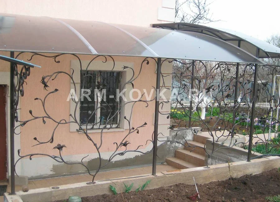 Кованый козырёк с изящным ажурным рисунком над входной дверью. Размер — 1500×1200 мм. Кровля — поликарбонат или профлист. Антикоррозийное покрытие, размер и цвет на выбор. Установка под ключ в Истре и Истринском районе.