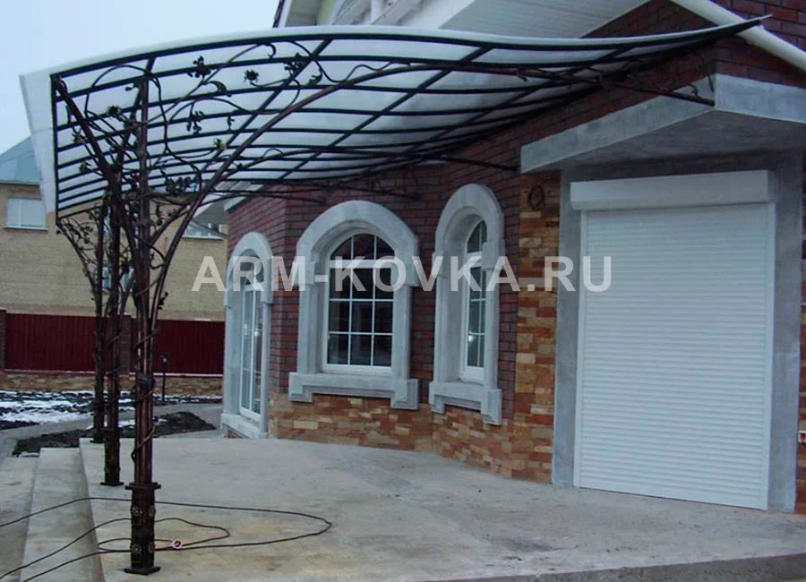 Компактный кованый козырёк с простым орнаментом. Практичный и стильный вариант для входной группы. Кровля — поликарбонат, размер подбирается индивидуально. Гарантия 5 лет, установка в Истре, замер бесплатно.