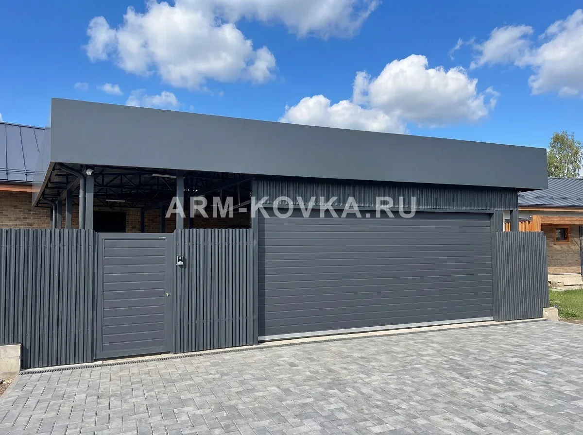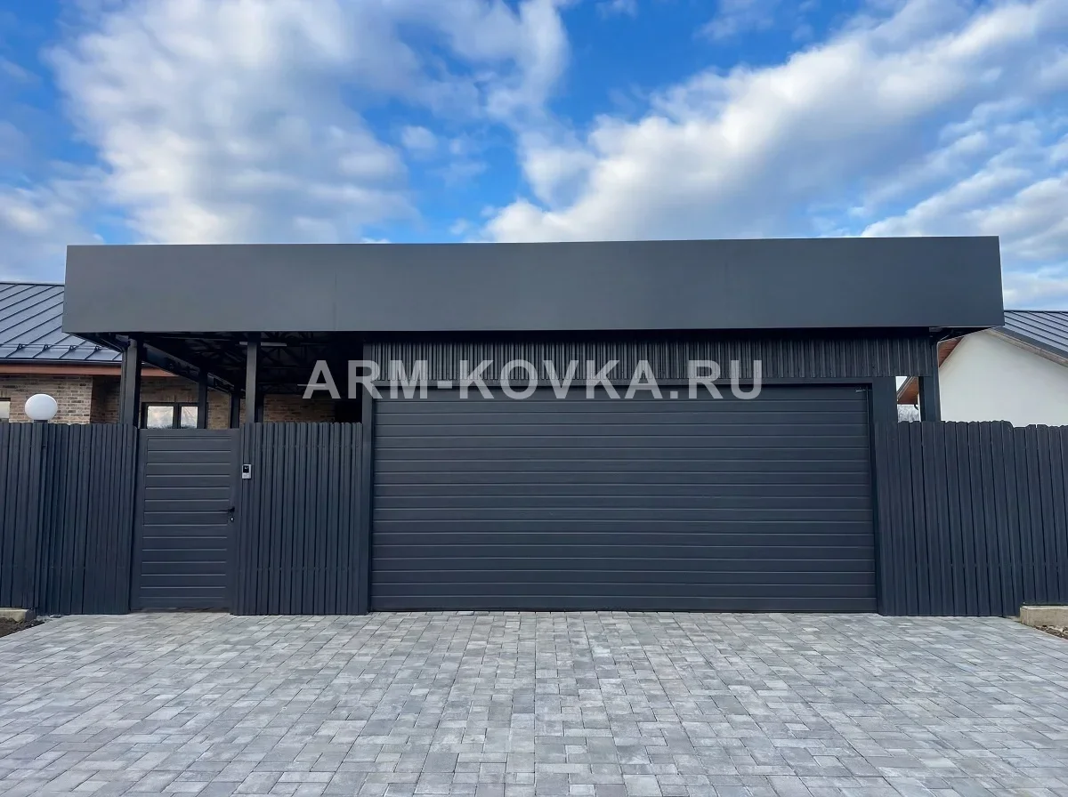 Крупногабаритный навес хай-тек размером 11,2×10,5 м — идеальное решение для навеса над несколькими автомобилями, зоной отдыха или хозяйственным двором. Фундамент: бетонирование опор в грунт на глубину 1200–1500 мм. Основной каркас собран из квадратной трубы 100×100×3 мм — стойки и балки. Двускатные фермы выполнены из труб 60×40×3 и 30×30×2 мм, прогоны — из трубы 40×40×2 мм. Кровля — сотовый поликарбонат толщиной 8 мм, цвет «Графит». Материал обеспечивает рассеянный свет и надёжную защиту от осадков. Фриз облицован алюминиевой композитной панелью 4 мм, цвет RAL 7024. Весь стальной каркас окрашен порошковым методом в RAL 7024.