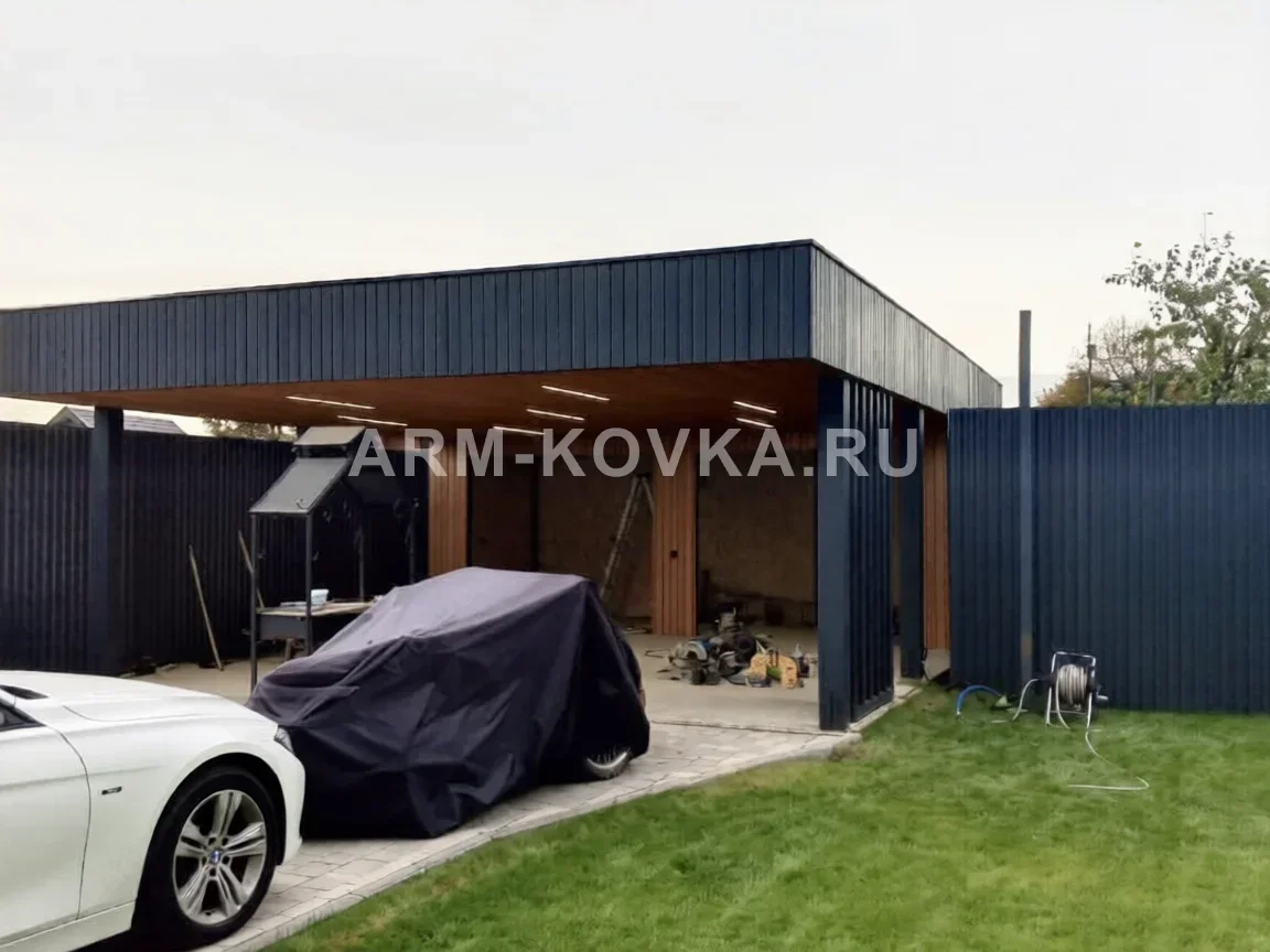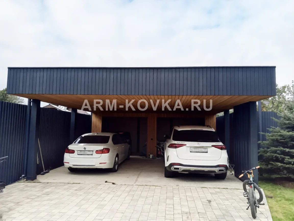 Дизайнерский навес премиум-класса на две машины с интегрированным освещением и отделкой натуральным деревом. Подшив потолка и задняя стенка выполнены из фасадной рейки (планкена) теплого оттенка, что создает эффект уютного гаража открытого типа. Массивный декоративный фриз по периметру облицован вертикальными панелями в цвете антрацит. Конструкция базируется на мощных стальных опорах и оснащена встроенными светодиодными светильниками для комфортной парковки в темное время суток.