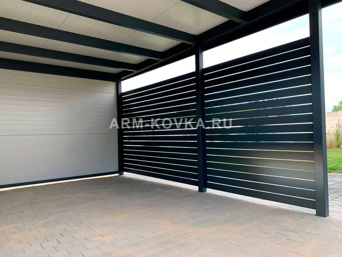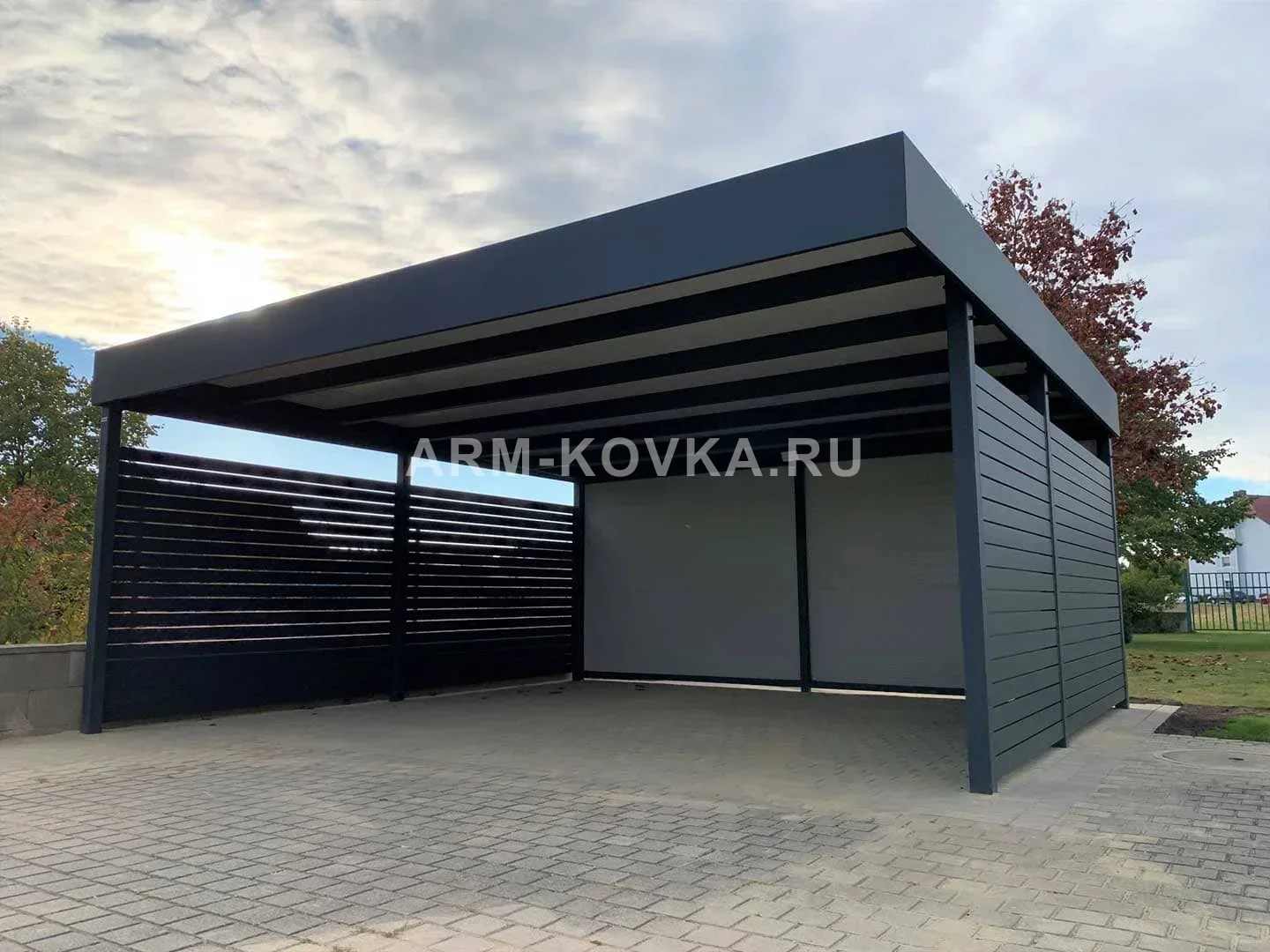 Современный отдельно стоящий навес на два автомобиля с плоской кровлей и массивным декоративным фризом. Боковая стена выполнена из широких горизонтальных стальных ламелей, обеспечивающих защиту от ветра и косого дождя. Внутренняя часть крыши имеет контрастный светлый подшив, который улучшает освещенность парковочного места. Металлоконструкция окрашена порошковым методом в глубокий антрацитовый цвет, что гарантирует долговечность и современный внешний вид.