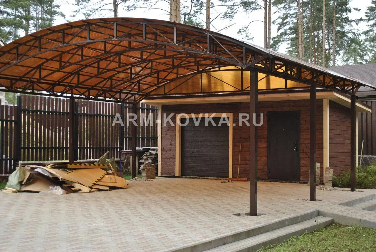 Масштабная металлоконструкция арочного типа, перекрывающая обширную площадку перед гаражным боксом. Основу силового каркаса составляют усиленные фермы с комбинированным заполнением (вертикальные стойки и диагональные раскосы), что гарантирует высокую несущую способность при широком пролете. Опорные столбы из профильной трубы сечением 100х100 мм обеспечивают устойчивость всей системы к боковым ветровым нагрузкам. Кровля выполнена из высококачественного сотового поликарбоната бронзово-янтарного оттенка толщиной 10 мм. Материал обладает отличными прочностными характеристиками и защитой от УФ-излучения, создавая комфортную полутень и защищая технику от перегрева. Конструкция включает в себя фронтонное заполнение из поликарбоната, что дополнительно защищает внутреннее пространство от косого дождя и снега. Каркас обработан износостойкой антикоррозийной эмалью темно-коричневого цвета (RAL 8017), идеально сочетающейся с деревянным фасадом здания и забором. Опорные стойки жестко зафиксированы в подготовленном основании из тротуарной плитки. Продуманная геометрия арки обеспечивает свободный маневр для габаритного транспорта и беспрепятственный сток осадков по обе стороны конструкции.