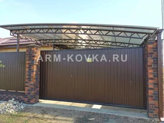 Несущий каркас навеса изготовлен из профильной стальной трубы сечением 60×60 и 40×40 мм. Конструкция опирается на кирпичные столбы въездной группы — анкерное крепление выполнено через закладные пластины, вмурованные в кладку. Сварные швы зачищены и обработаны антикоррозийным составом. Кровельный каркас выполнен в виде арочных ферм с треугольной решёткой из профильной трубы 40×20 мм. Арка формируется методом холодного гнутья, шаг ферм — 800–1000 мм. Ферменная система обеспечивает жёсткость без провисания при пролёте 3–4 м над воротным проёмом. Кровельное покрытие — сотовый поликарбонат толщиной 8–10 мм бронзового (дымчатого) оттенка. Крепление через алюминиевые прижимные профили с термошайбами; торцы листов закрыты алюминиевым торцевым профилем для защиты от попадания влаги и насекомых в ячейки. Металлические элементы обработаны порошковой краской в цвете RAL 8017 (шоколадно-коричневый), что визуально согласуется с полотном ворот и тоном кирпичной кладки столбов. Покрытие термостойкое, устойчиво к УФ-излучению. Навес функционально совмещён с откатными воротами, обшитыми профлистом С-20 в тёмно-коричневом цвете. Конструкция защищает воротный механизм и въездную зону от осадков, увеличивает срок службы приводного оборудования. Возможен монтаж скрытого водоотвода через стойки в кирпичных столбах.