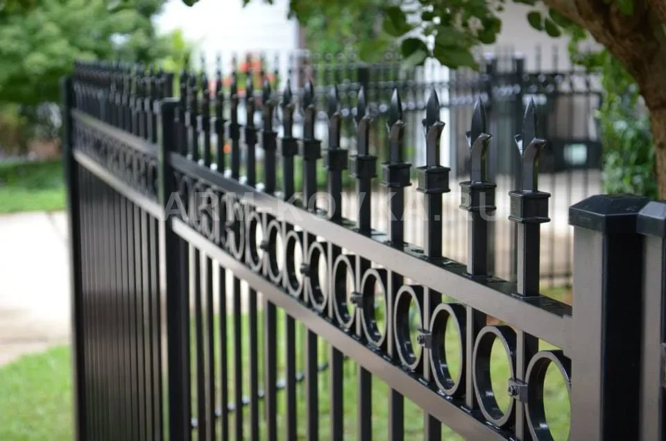 Лаконичное и строгое металлическое ограждение, выполненное в стиле неоклассики. Модель «Манчестер» отличается четкой геометрией и ритмичным рисунком, что делает её универсальным решением для современных коттеджных поселков и городских территорий в Истринском районе. Забор сочетает в себе высокую прочность конструкции и эстетическую сдержанность. Конструкция секции визуально разделена на два функциональных уровня. Основное полотно набрано из вертикальных стальных прутьев, обеспечивающих надежную защиту периметра. Верхний декоративный пояс (фриз) представляет собой ряд колец, зажатых между горизонтальными направляющими, что придает ограждению характерный индустриальный облик. Завершают композицию массивные остроконечные пики на кубических основаниях, которые служат одновременно и защитным элементом, и выразительным декором. Изделие изготовлено из высококачественного металлического профиля с износостойким порошковым напылением глубокого черного цвета. Покрытие надежно защищает металл от коррозии и сохраняет насыщенность оттенка под воздействием ультрафиолета. Ограждение «Манчестер» — это выбор тех, кто ценит архитектурную строгость, долговечность и современный подход к дизайну экстерьера.
