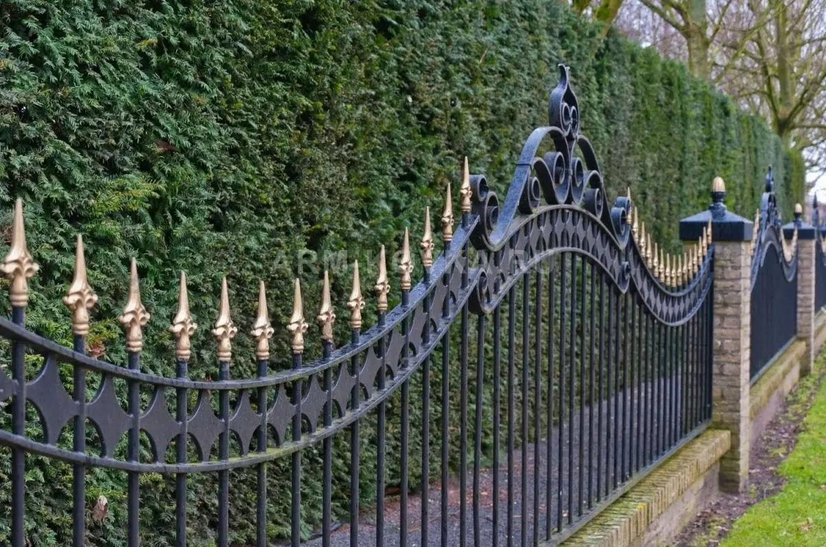 Величественное и богато декорированное ограждение, выполненное в стиле высокого классицизма. Модель идеально подходит для фасадного оформления загородных усадеб и престижных владений в Истринском районе. Секции забора имеют сложный волнообразный профиль верхнего края, который в центре каждой секции переходит в торжественное фигурное навершие, состоящее из крупных S-образных волют и завитков. Главным художественным акцентом композиции является декоративный пояс, состоящий из ритмично повторяющихся ромбовидных элементов. Каждый вертикальный прут в верхней части секции увенчан литым навершием в форме геральдической лилии, что придает конструкции исторический и статусный облик. Опорные столбы из декоративного кирпича дополнены коваными колпаками с шаровидными наконечниками, обеспечивая законченность всего архитектурного ансамбля. Ограждение изготовлено из полнотелого металлического профиля и квадрата, прошедших многоэтапную антикоррозийную обработку. Основное полотно окрашено в глубокий черный матовый цвет. Для придания изделию особой роскоши, геральдические лилии и центральные декоративные элементы вручную акцентированы золотой патиной. Забор «Герцог» — это сочетание надежной защиты и безупречного стиля, созданное для ценителей эксклюзивной художественной ковки.