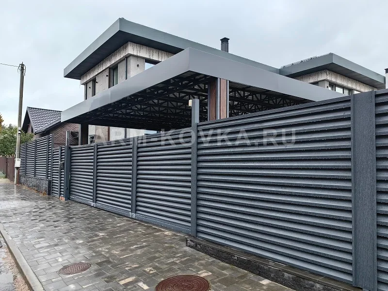 Ультрасовременное ограждение в стиле минимализм, разработанное специально для объектов современной архитектуры в Истринском районе. Модель «Хай-Тек» представляет собой монументальную конструкцию, обеспечивающую абсолютную приватность и надежную защиту территории при сохранении высоких эстетических стандартов индустриального дизайна. Заполнение секций выполнено из широких стальных ламелей Z-образного профиля, установленных с минимальным нахлестом. Такая конфигурация полностью исключает просматриваемость участка с улицы, при этом сохраняя естественную вентиляцию и отвод влаги. Особенностью данной модели является использование фактурного порошкового напыления «Муар», которое придает металлу благородную матовую поверхность и дополнительную глубину цвета, эффективно скрывая мелкие загрязнения и капли дождя. Секции интегрированы в единую систему с откатными воротами и калиткой, создавая непрерывную визуальную линию. Массивные металлические столбы и основание, облицованное темным камнем, подчеркивают основательность и долговечность конструкции. Изделие изготовлено из оцинкованной стали повышенной толщины, что гарантирует устойчивость к деформациям и сохранение геометрии на протяжении всего срока службы. Ограждение «Хай-Тек» — это бескомпромиссное решение для тех, кто выбирает стиль, технологичность и максимальный уровень комфорта.
