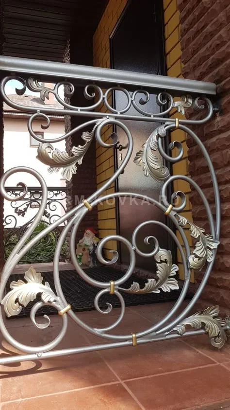 Изысканное кованое ограждение премиум-класса, выполненное в стиле высокого барокко. Эта модель создана для украшения балконов, террас и входных групп загородных резиденций в Истринском районе, где архитектура требует особого внимания к деталям. Дизайн ограждения строится на динамичном переплетении крупных волют и пышных растительных элементов, создавая ощущение легкости при исключительной прочности конструкции. Центральную часть композиции занимают объемные кованые листья аканта, которые словно «вырастают» из плавных завитков основного каркаса. Особый шик изделию придают декоративные соединительные хомуты, окрашенные в цвет яркого золота, которые контрастно выделяются на фоне основного серебристого полотна. Верхняя часть ограждения дополнена изящным фризом из мелких завитков, расположенным непосредственно под массивным поручнем, что обеспечивает эстетическую законченность и дополнительную жесткость. Ограждение выполнено из полнотелого металлического проката высшего качества. Многослойное покрытие жемчужно-серебристого цвета не только защищает металл от любых атмосферных воздействий, но и придает ему благородное сияние. Ручная проработка каждого листка и золотое патирование превращают это ограждение в настоящее произведение кузнечного искусства, которое станет доминантой экстерьера вашего дома.
