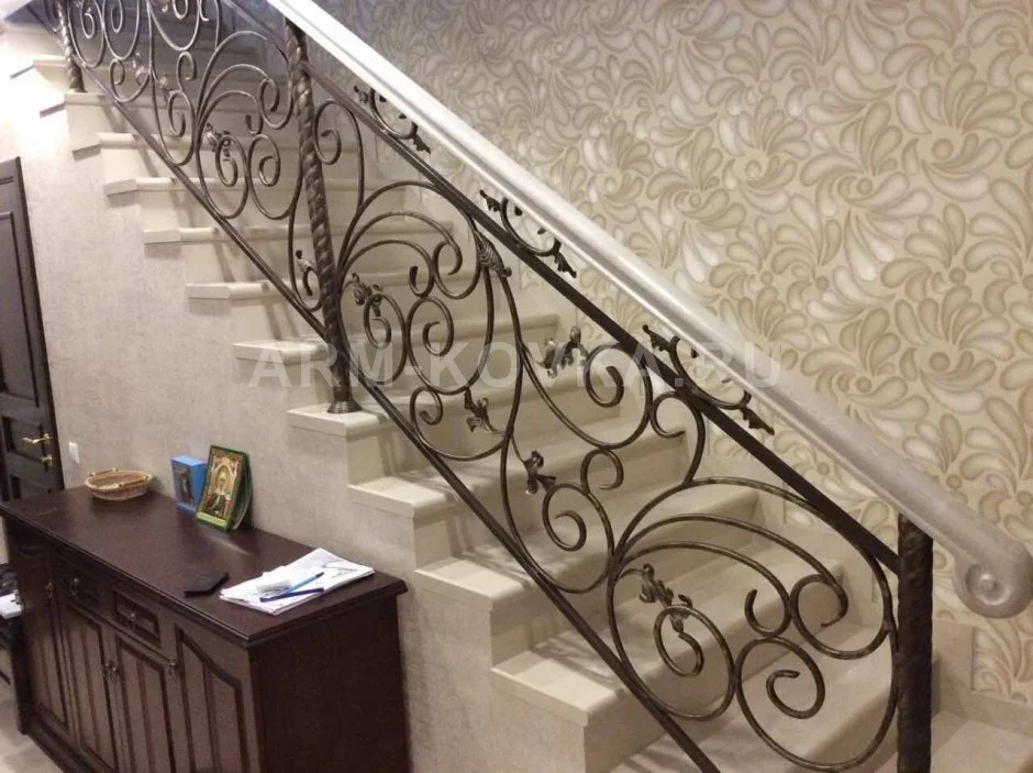Роскошное кованое ограждение для парадного входа, выполненное в стиле классицизма. Узор секций состоит из крупных волют, изящно дополненных литыми рельефными листьями аканта и декоративными навершиями в форме шаров на соединительных элементах. Массивные опорные столбы имеют сложную точеную форму с канелюрами и украшены розетками с цветочным мотивом. Особую выразительность конструкции придает финишная отделка в цвете «античная бронза» с благородным блеском, который подчеркивает каждую деталь ручной работы. В дополнение к основному ограждению на стене установлен пристенный поручень в аналогичном стиле, обеспечивающий максимальный комфорт при подъеме. Перила идеально сочетаются с фасадной отделкой «сайдинг» и ступенями из керамической плитки, придавая входной группе законченный и респектабельный вид. Все элементы защищены многослойным покрытием, устойчивым к атмосферным воздействиям.