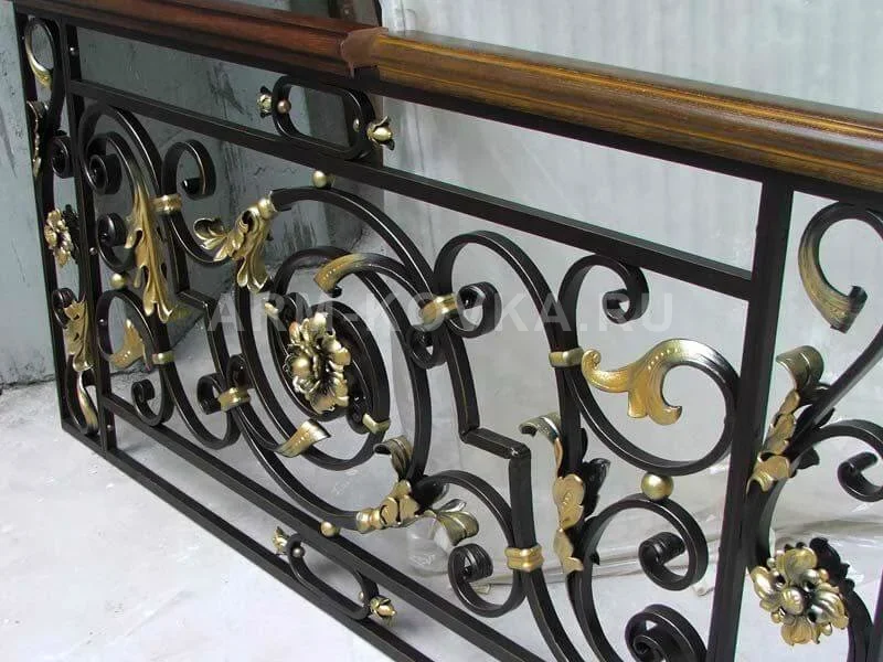 Роскошное интерьерное ограждение, выполненное в стиле барокко с элементами византийского орнамента. Сложная художественная композиция построена вокруг центральных розеток в виде распустившихся цветов, окруженных динамичными S-образными и C-образными волютами. Рисунок дополнен изящными литыми листьями и декоративными кольцами, создающими многослойный объемный эффект. Металл окрашен в глубокий черный цвет, на который вручную нанесена контрастная золотая патина, подчеркивающая фактуру каждого лепестка и изгиба ковки. Верхнюю часть конструкции венчает массивный поручень из натурального дерева теплого оттенка с благородным блеском лакового покрытия. Рамная конструкция с четкими прямоугольными контурами обеспечивает высокую прочность и устойчивость секций. Данная модель станет доминантным акцентом в классическом интерьере, подчеркивая статус и изысканный вкус владельца дома.
