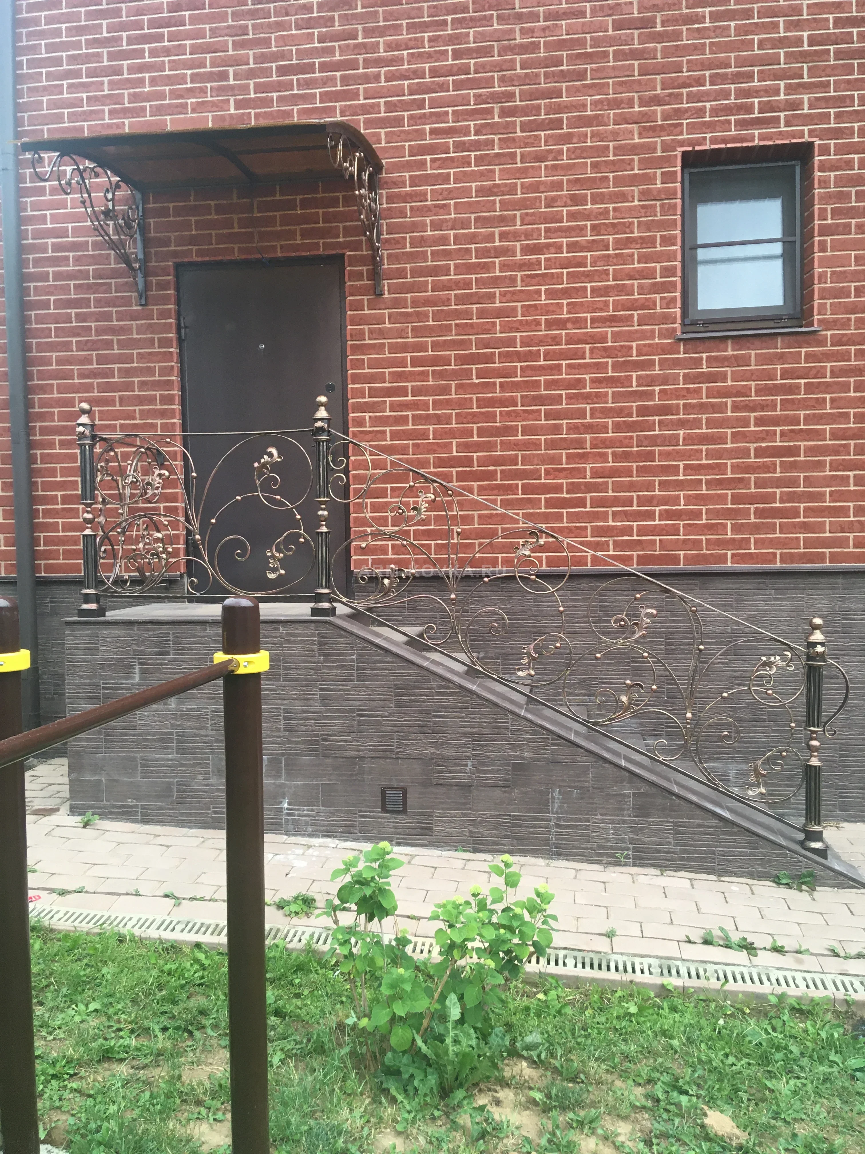 Комплексное решение для оформления входной группы, включающее в себя лестничные перила и настенный козырек, выполненные в едином художественном стиле. Рисунок ограждения построен на симметричных завитках и литых растительных элементах, создающих ажурный, но при этом прочный защитный барьер. Козырек имеет изящные кронштейны, повторяющие орнамент перил, и дополнен декоративным фризом по переднему краю. Покрытие выполнено в благородном цвете «античная бронза», которое идеально сочетается с коричневой металлической дверью и красным облицовочным кирпичом. Такая комбинация элементов создает законченный и статусный образ фасада частного дома.