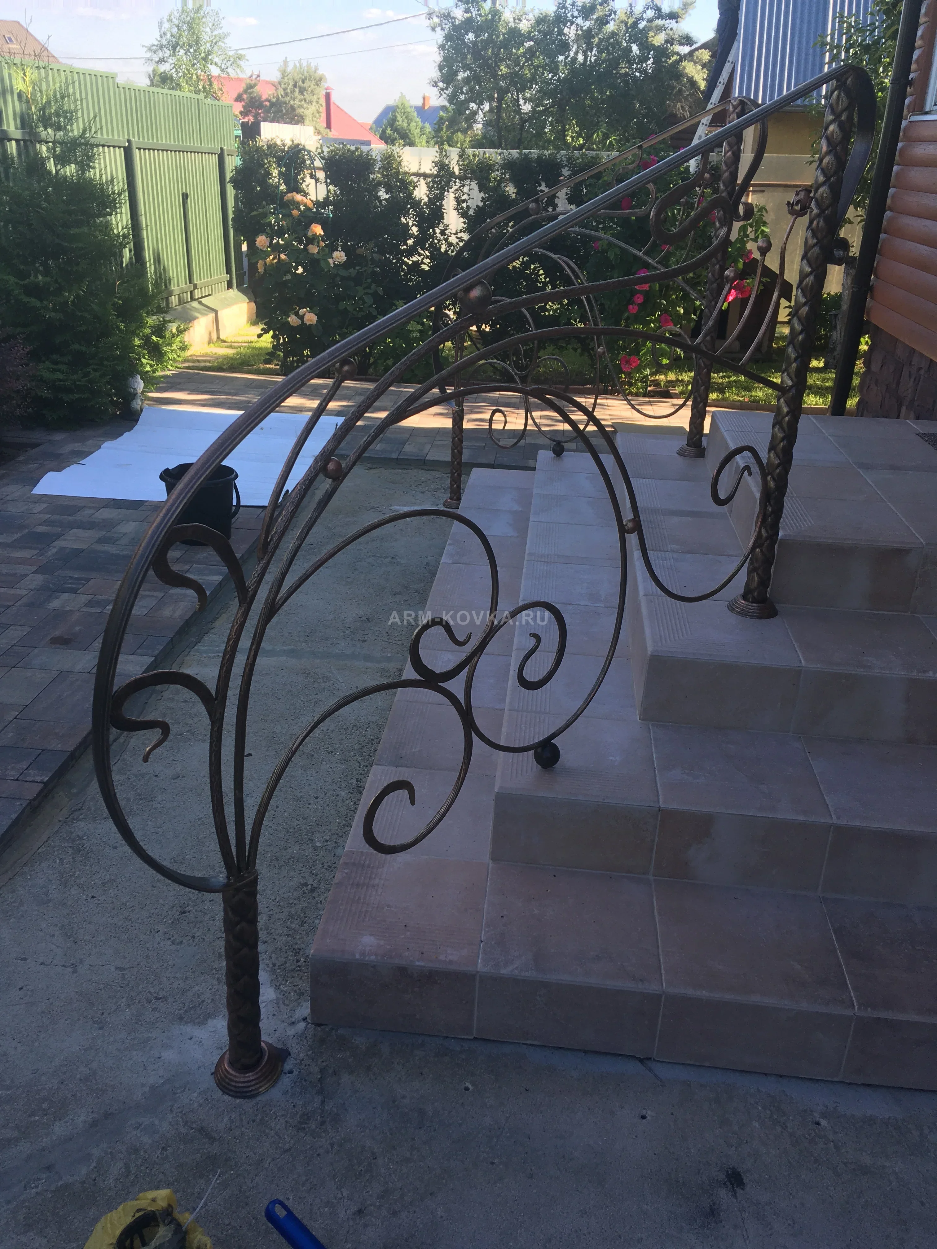 Изящное уличное ограждение, выполненное с использованием сложных радиусных изгибов, которые придают конструкции динамику и легкость. Художественный узор построен на переплетении плавных волют и тонких кованых прутьев, напоминающих естественные изгибы растений. Особую прочность и эстетическую завершенность модели придают опорные столбы с выраженной витой фактурой («косичка»), имитирующей плетение каната. Изделие окрашено в благородный темно-коричневый цвет с деликатным медным напылением, которое подчеркивает рельеф ковки. Перила плавно огибают ступени, облицованные светлой плиткой, создавая безопасный и эстетичный спуск в зону отдыха или сад. Благодаря качественному защитному покрытию, металл надежно защищен от коррозии при эксплуатации на открытом воздухе.