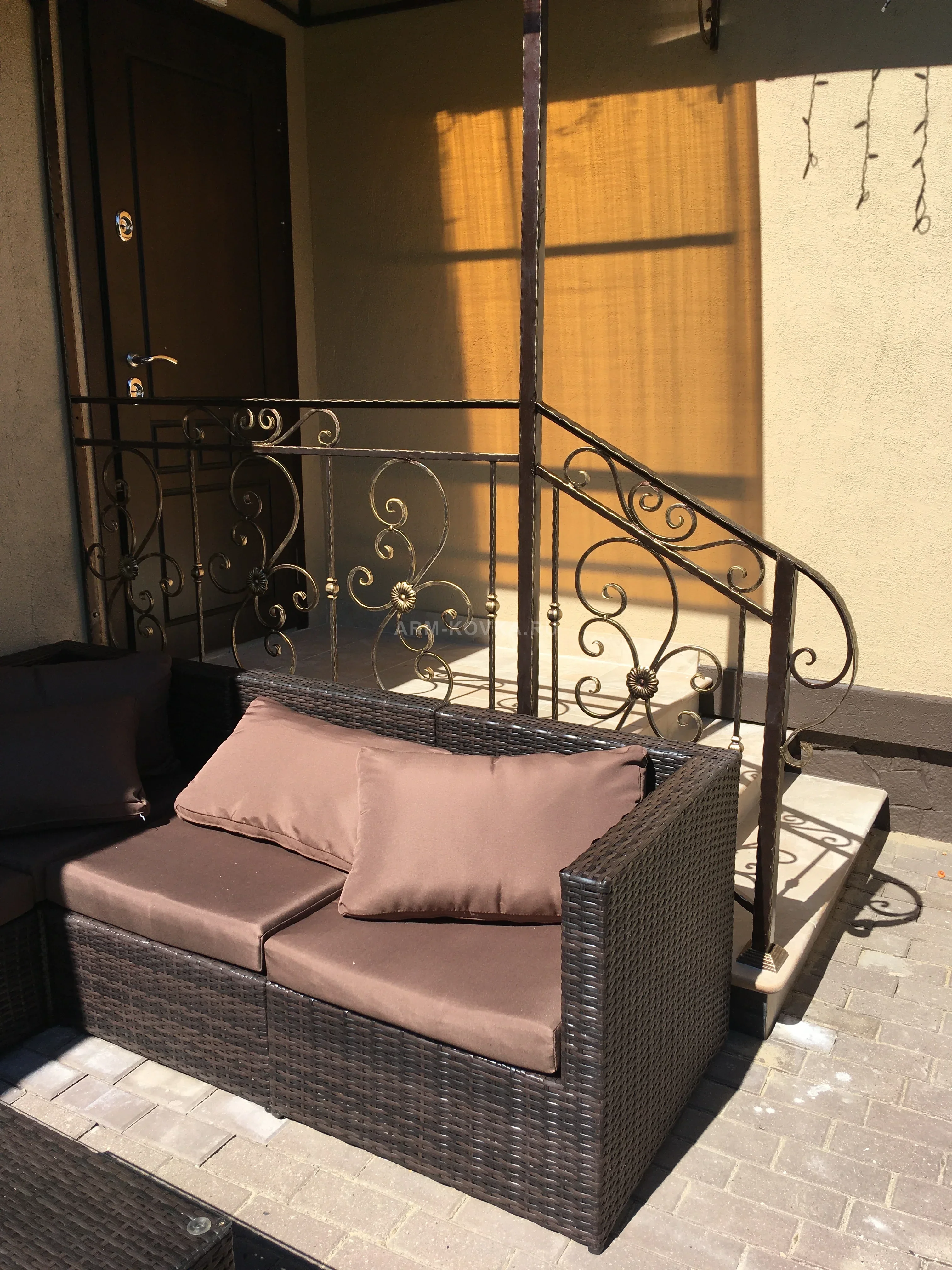 Полноценное оформление входной зоны, включающее в себя изящные кованые перила и функциональный арочный козырек. Дизайн всей группы выдержан в едином стиле: декоративные волюты и литые элементы в виде розеток-цветов создают нарядный и гостеприимный образ дома. Козырек имеет классическую дугообразную форму, усиленную коваными кронштейнами с завитками, и перекрыт качественным сотовым поликарбонатом бронзового оттенка, который мягко рассеивает солнечный свет. Перила плавно спускаются по ступеням, обеспечивая надежную опору. Вся конструкция окрашена в глубокий темный цвет с эффектом античного золотого патинирования, что придает металлу благородный блеск и подчеркивает ручную работу мастера. Такая входная группа не только защищает крыльцо от осадков, но и служит главным архитектурным украшением фасада.