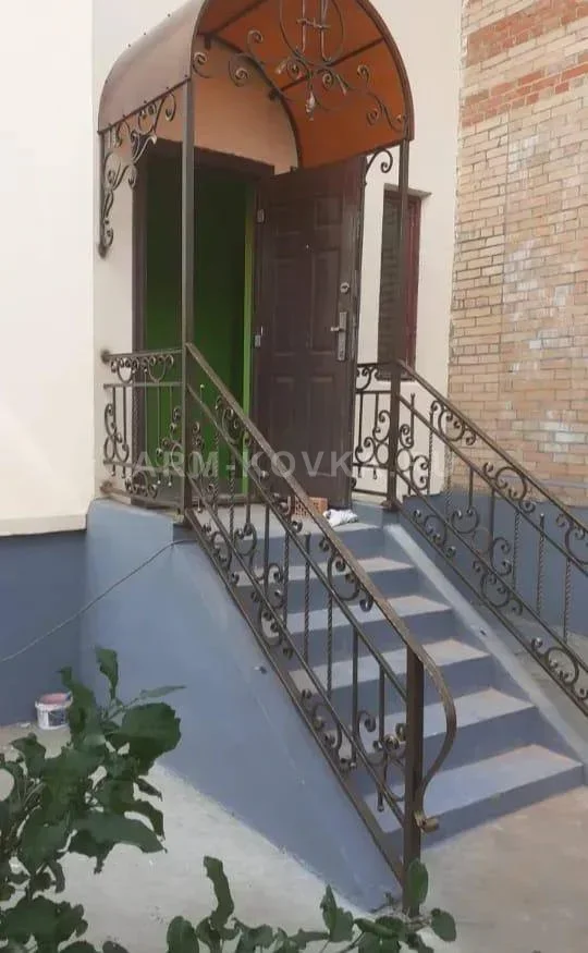 Масштабный кованый ансамбль для высокого крыльца, включающий в себя глубокий арочный козырек и защитные ограждения. Главной особенностью группы является купольный навес на четырех опорах, украшенный изящными волютами и декоративной вставкой по центру фасада. Светопрозрачная кровля выполнена из поликарбоната теплого оттенка, который защищает площадку перед дверью от осадков. Перила имеют комбинированный рисунок: классические S-образные завитки в верхней части и орнамент из переплетенных колец и вертикальных стоек в основной секции. Поручень плавно изгибается на спуске, обеспечивая комфорт и безопасность на высокой бетонной лестнице. Вся конструкция выполнена в темном цвете с благородным бронзовым патинированием, что придает комплексу антикварный вид и надежно защищает металл от воздействия внешней среды. Это решение превращает обычный вход в парадную зону, подчеркивая архитектурный стиль здания.