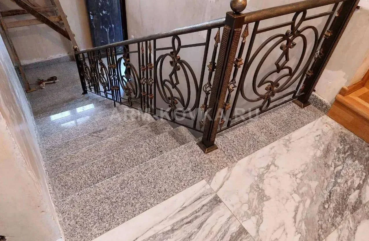 Массивное и статусное ограждение для внутренних лестниц, выполненное в неоклассическом стиле с элементами античного декора. Рисунок секций представляет собой сложные симметричные медальоны, дополненные коваными пиками и геометрическими вставками. Особую архитектурную ценность модели придают широкие опорные столбы, украшенные чеканным узором «меандр» (греческий ключ) и увенчанные крупными металлическими шарами. Изделие окрашено в глубокий темный цвет с эффектом античной бронзы, что подчеркивает сложность фактуры и детальную проработку каждого элемента. Перила установлены на гранитную лестницу с выраженной текстурой, создавая монументальный и завершенный образ парадного интерьера. Это идеальный выбор для классических особняков и домов, где ценится надежность и вневременная эстетика.